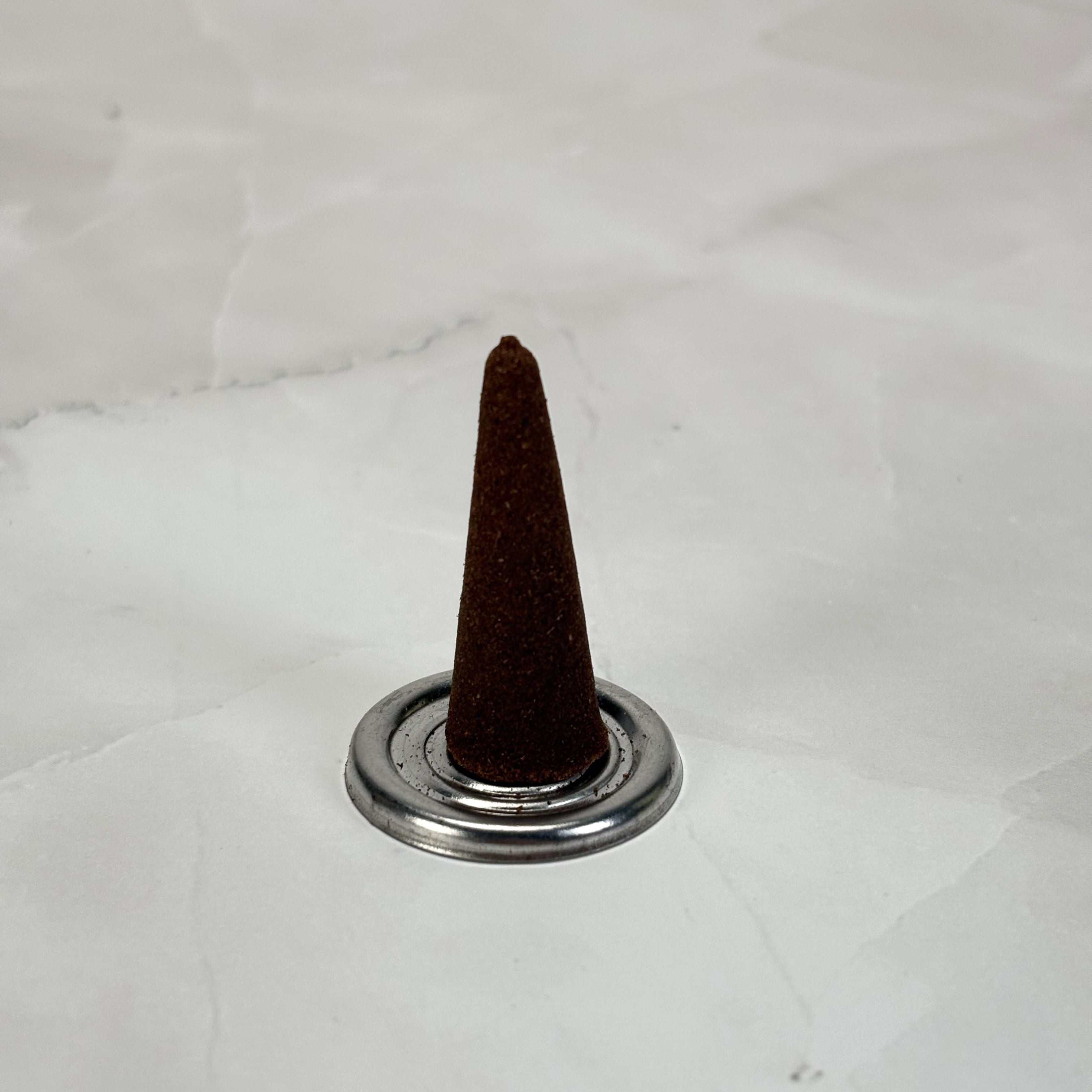 Pour allumer un cône d’encens, placez-le sur un porte-encens résistant à la chaleur, avec une base plate conçue pour le stabiliser. Allumez la pointe du cône avec une flamme, laissez brûler quelques secondes, puis soufflez doucement pour éteindre la flamme. Une fine braise continuera de se consumer lentement, libérant la fumée parfumée.