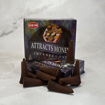 Cet encens en cônes Attire l'Argent de la marque Hem aidera à faire venir l'argent et la prospérité à vous et sous différentes formes (commerciales, opportunités, économies, chance,...).