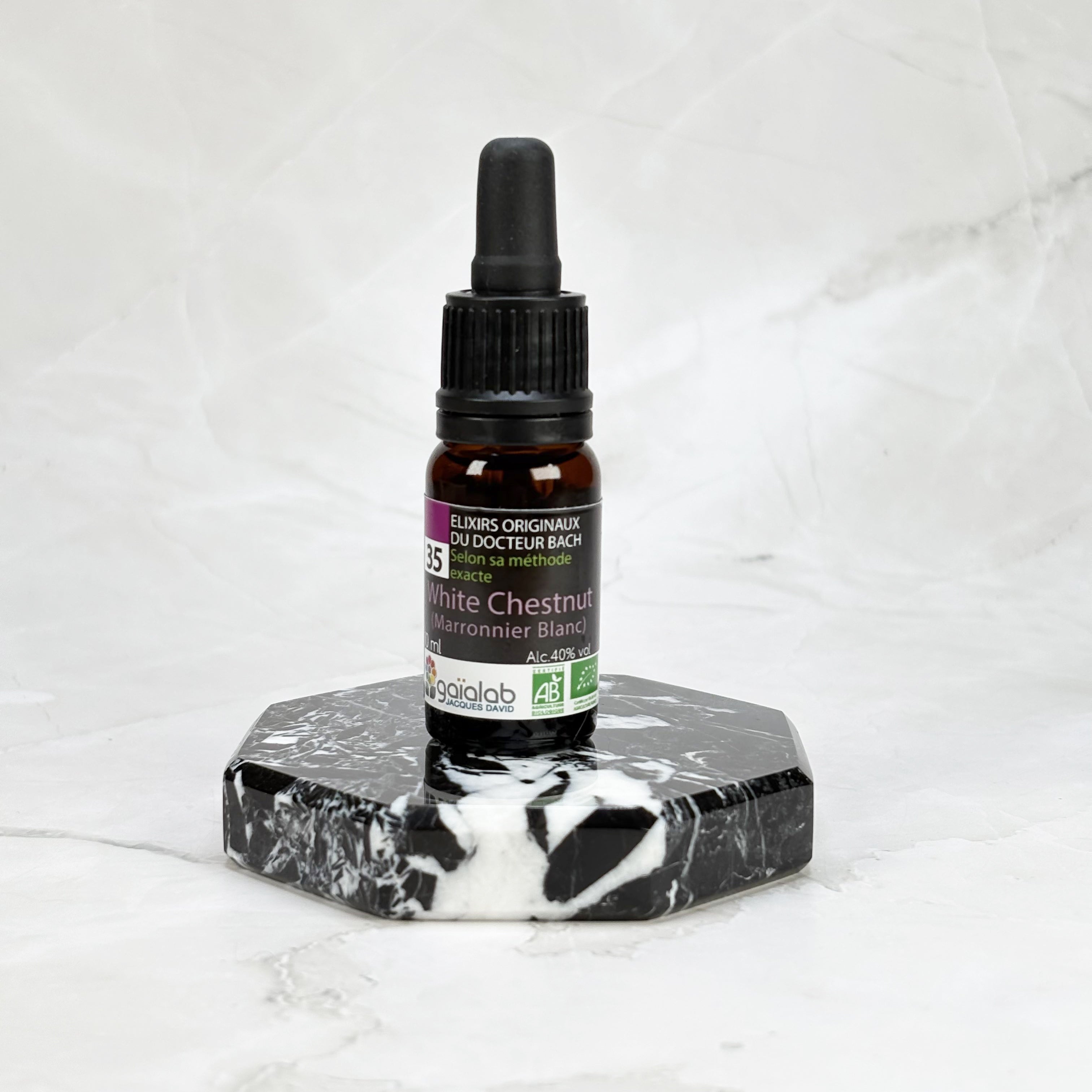 La fleur de Bach 35 Marronnier blanc (White Chestnut) s’adresse à ceux dont l’esprit ne se repose jamais. Une pensée tourne en boucle, une conversation ressurgit, des scénarios se répètent… Comme un disque rayé, ou un écureuil qui tourne dans sa roue. Impossible de se détacher, même quand tout est terminé.