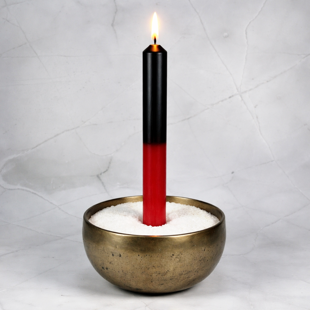 Ensemble, le rouge et le noir forment une synergie puissante, renforçant la capacité à bannir les énergies indésirables, à protéger contre les attaques psychiques et à résoudre les conflits avec force et détermination. Ce cierge bicolore est particulièrement utile pour les sorts nécessitant une protection renforcée et une action décisive, transformant les énergies négatives en forces positives.