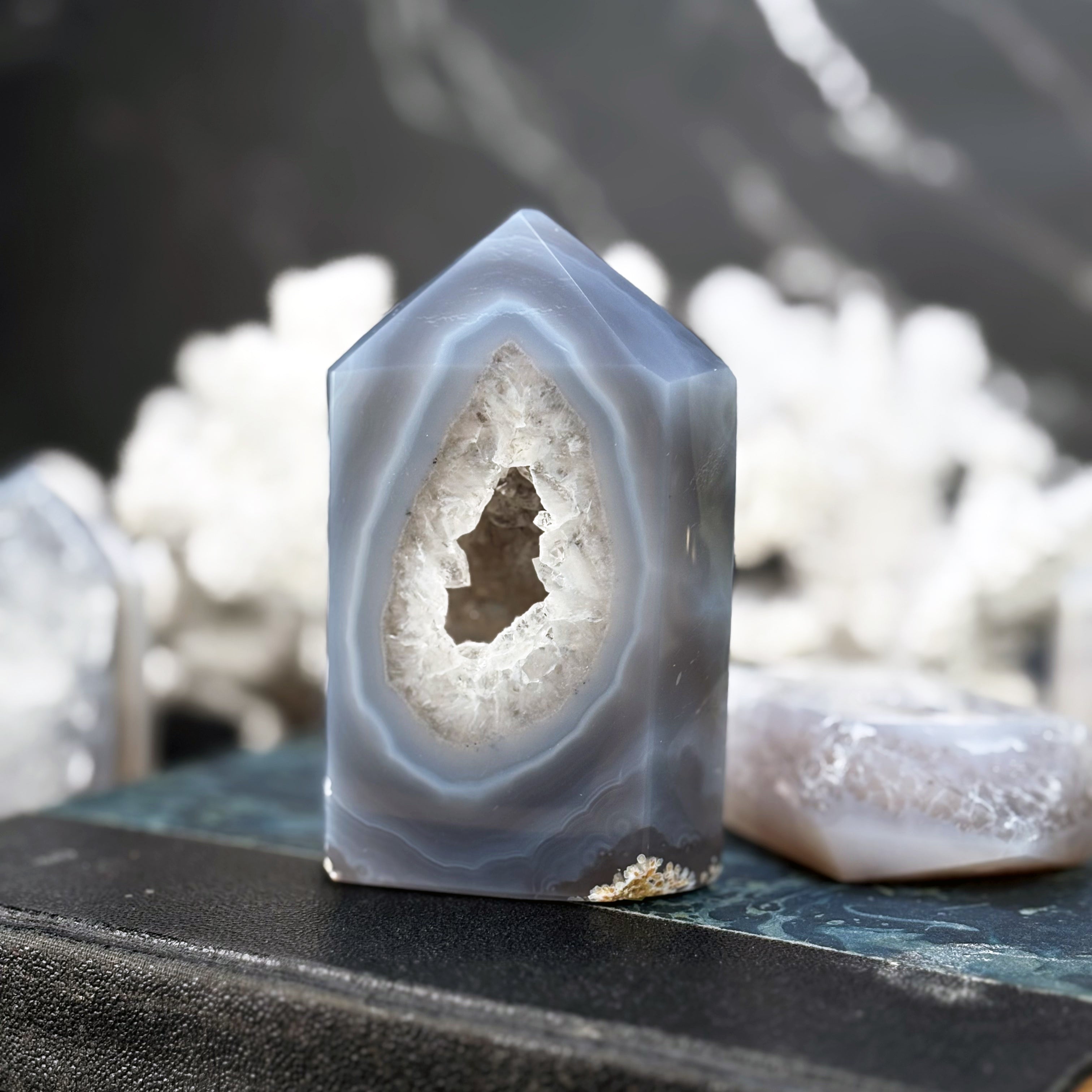 Cette tour d'Agate Druzy de qualité Excelsus (AAA) a été scindée puis polie en pointe afin de dévoiler son coeur en cristal naturel. Cette forme est également connue sous le nom de cabochon.