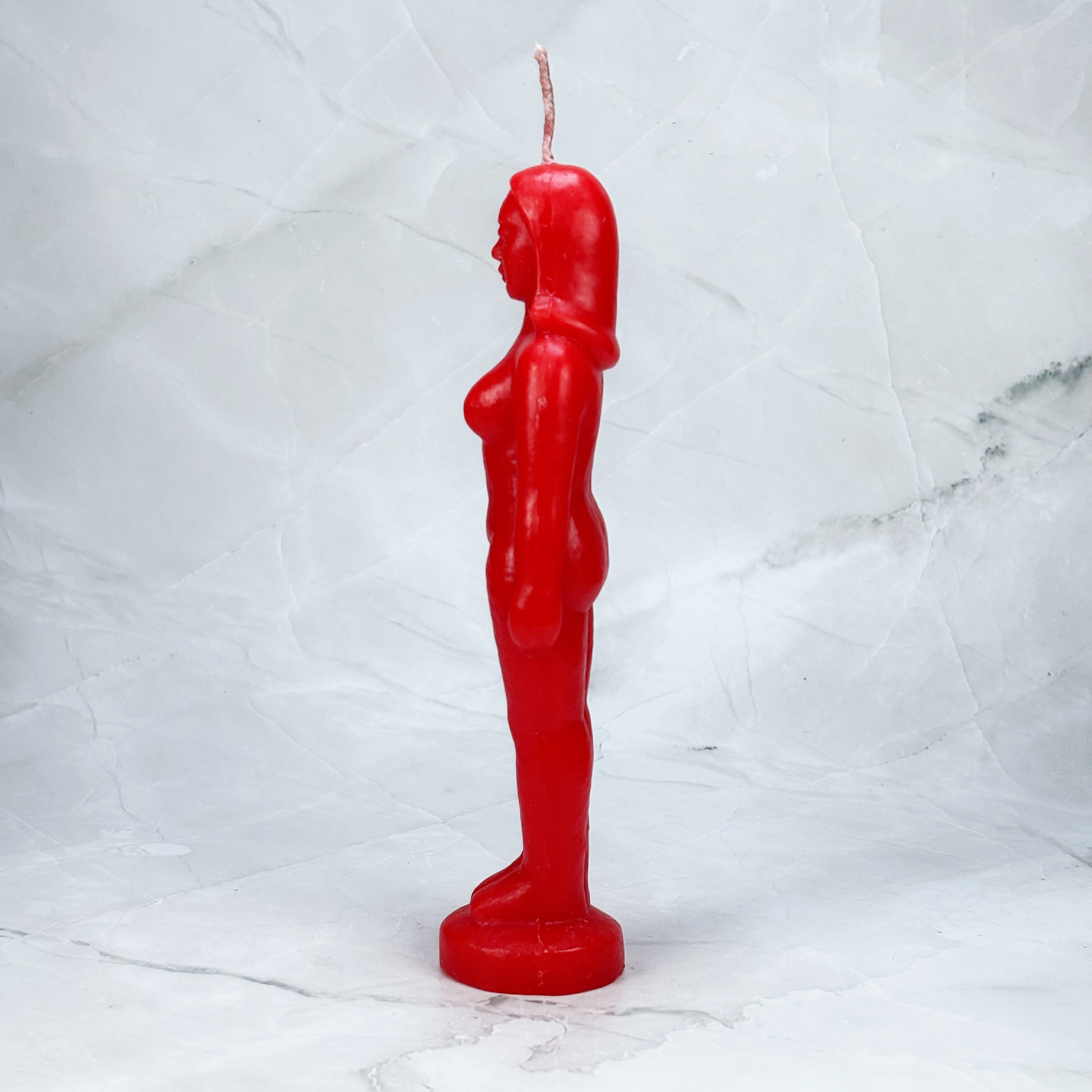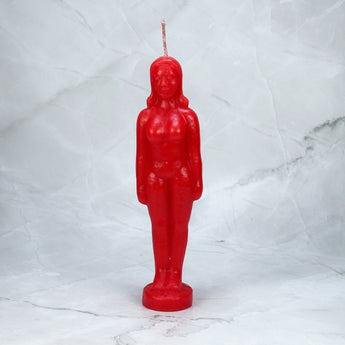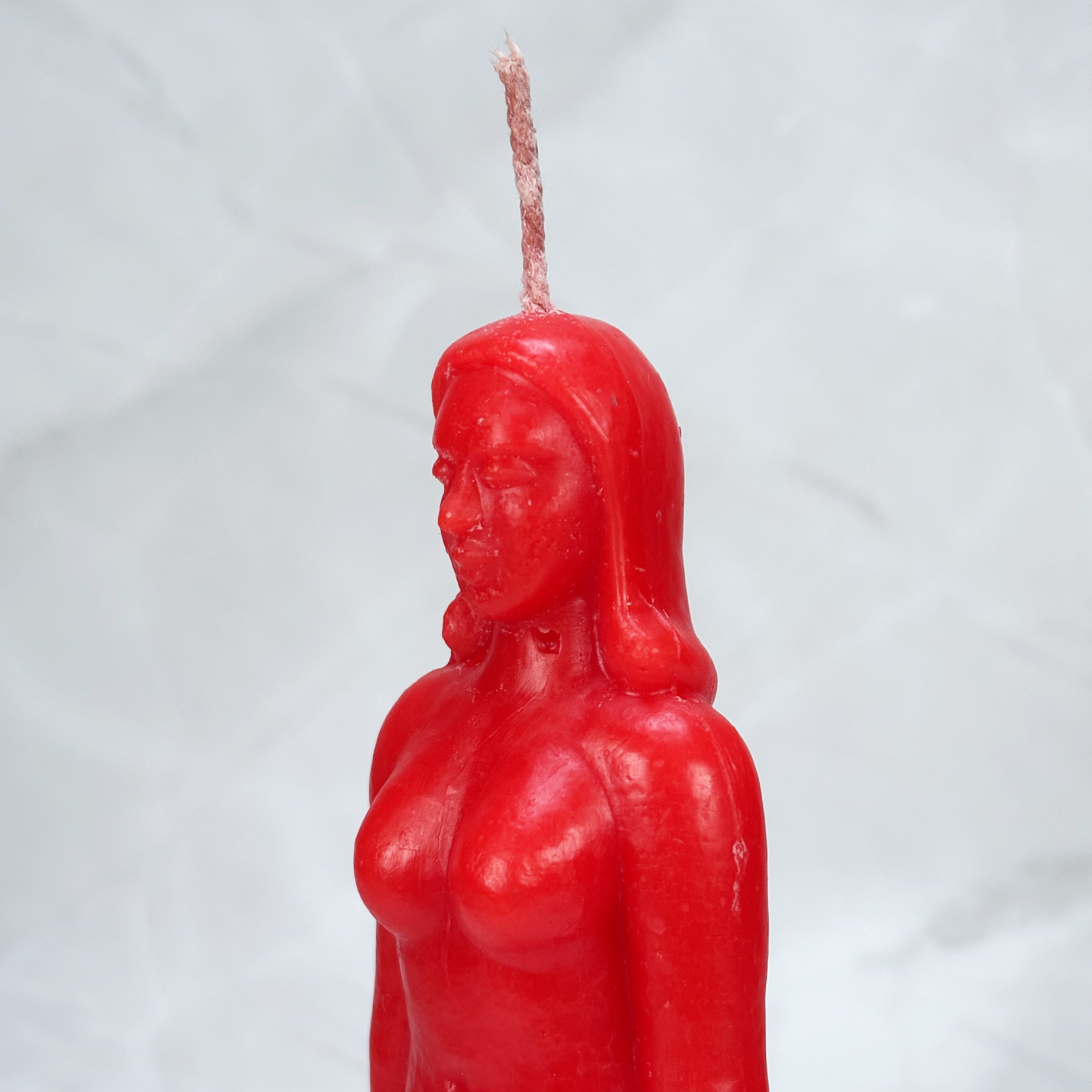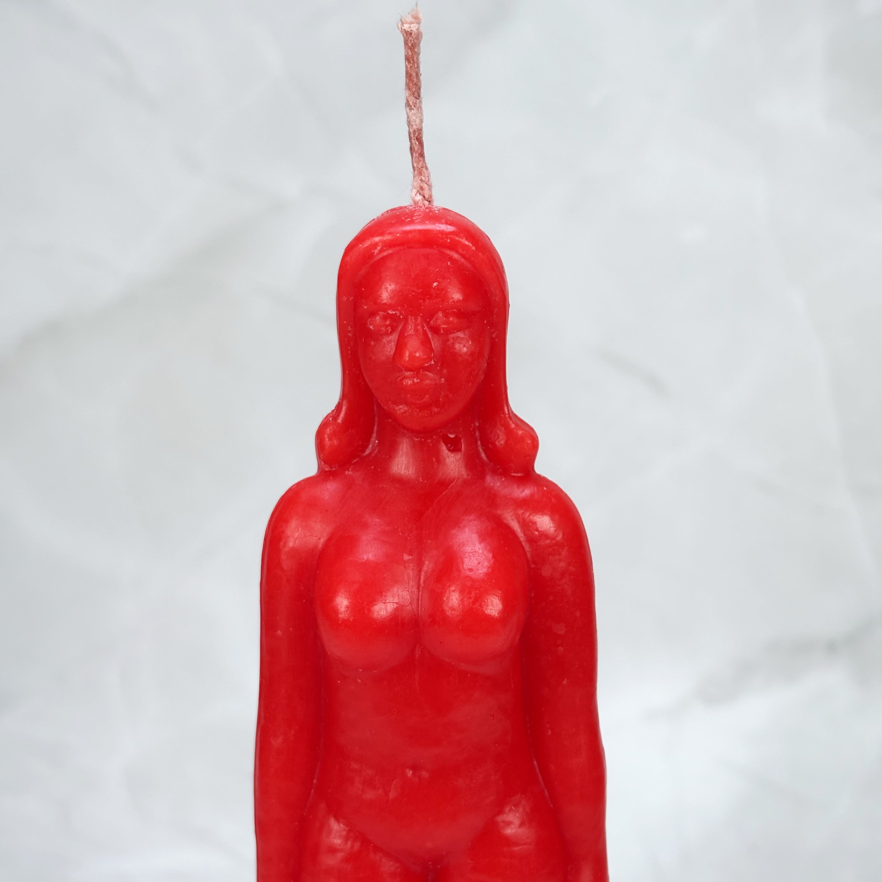 Cette grande bougie Dagyde à l'effigie d'une femme et de couleur rouge (teintée masse) est dédiée aux rituels visant à améliorer l'amour, la passion, les sentiments et la sexualité.