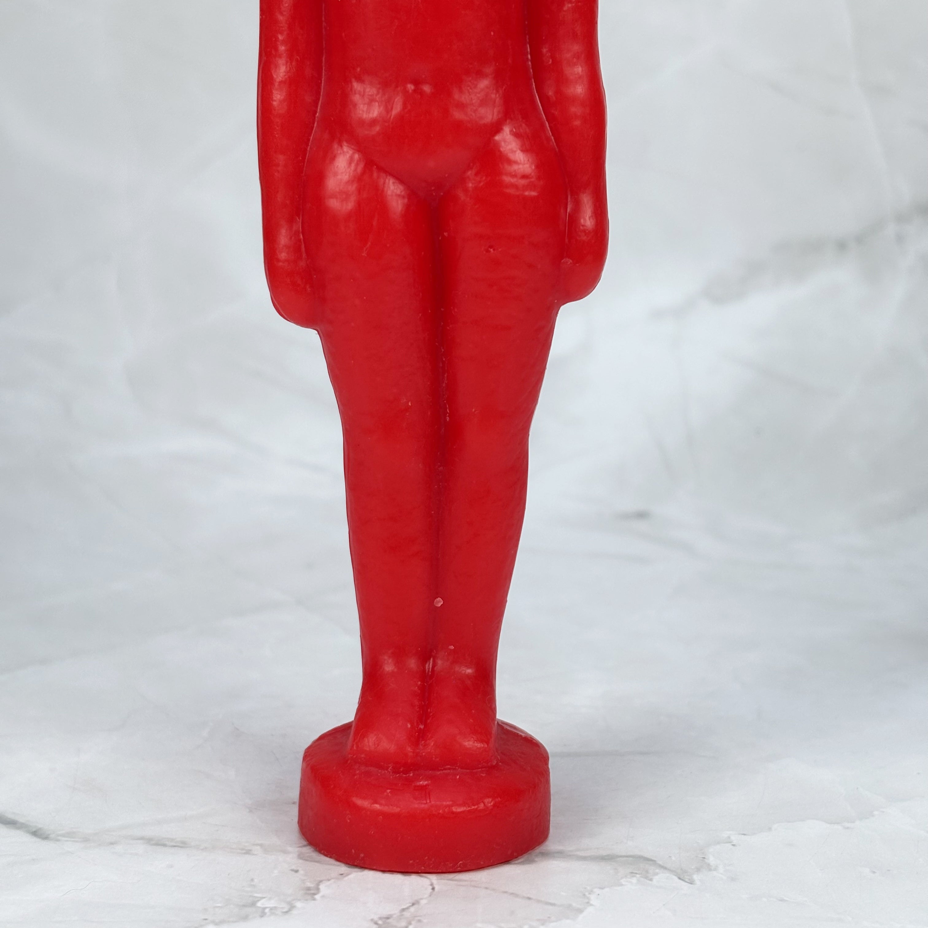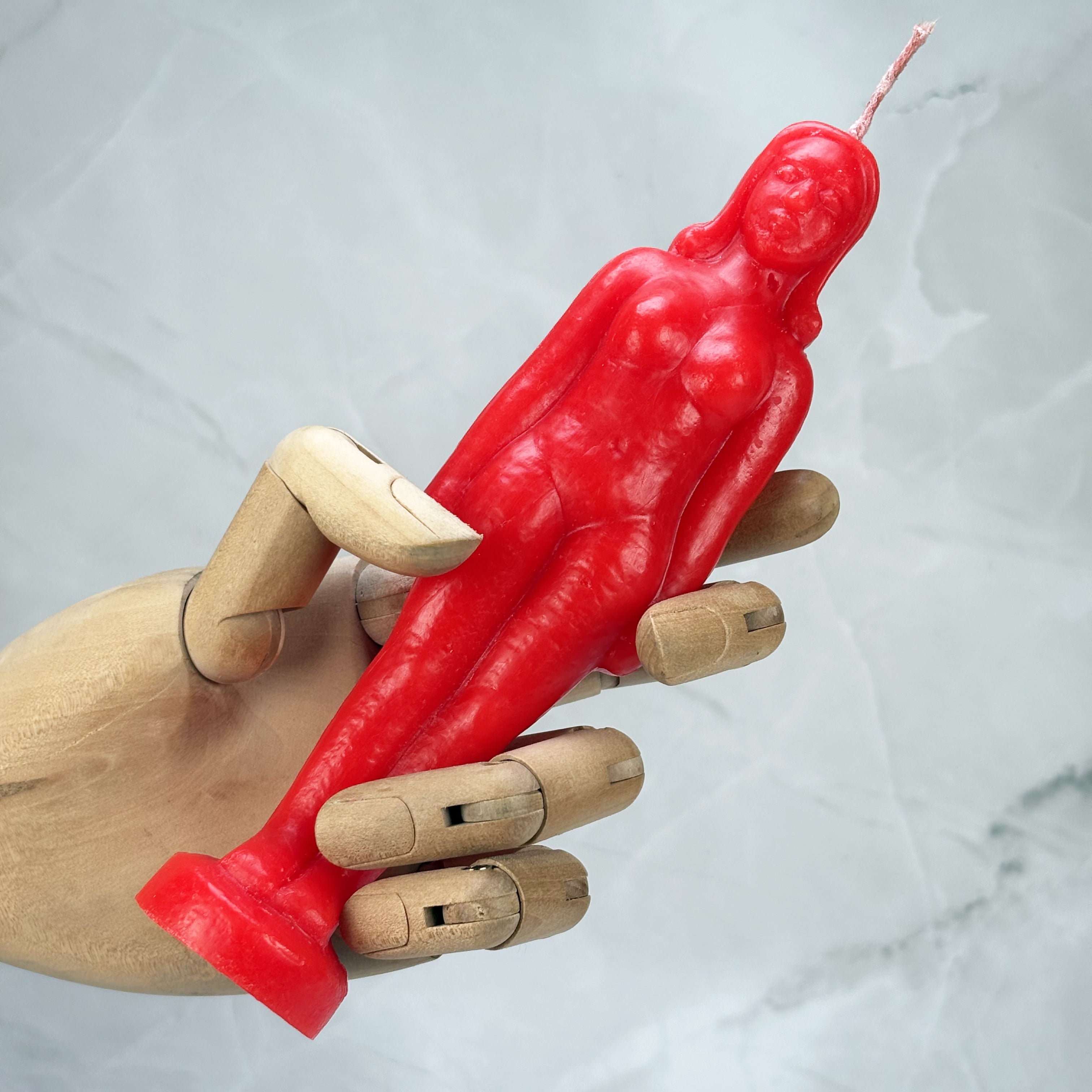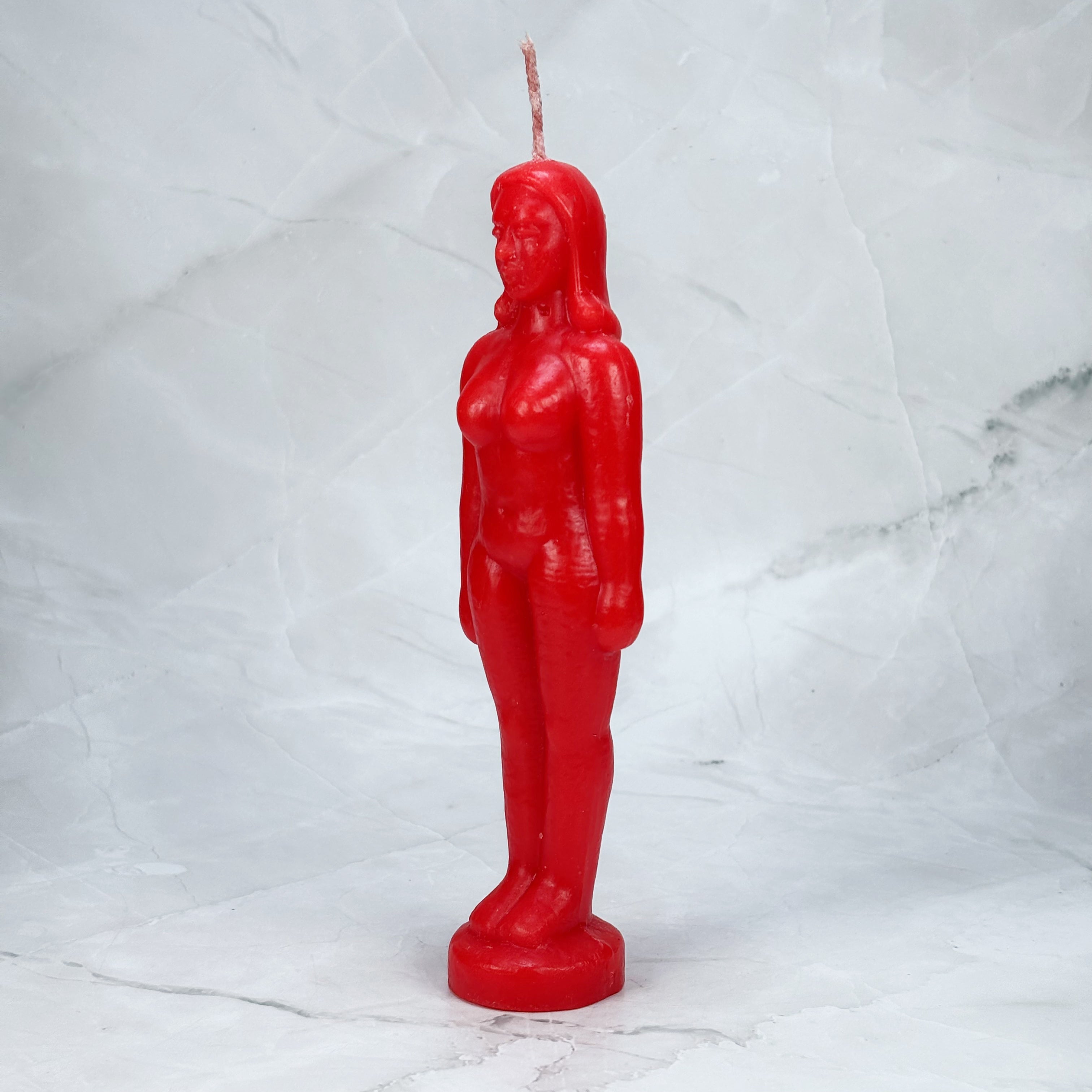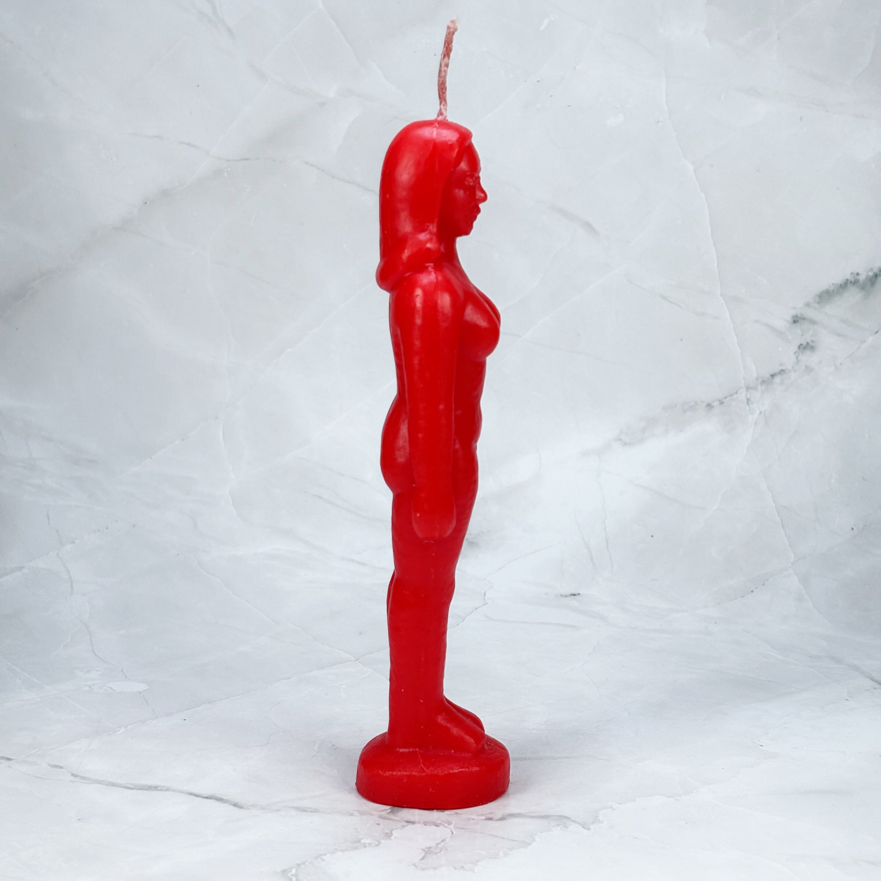 Cette grande bougie Dagyde à l'effigie d'une femme et de couleur rouge (teintée masse) est dédiée aux rituels visant à améliorer l'amour, la passion, les sentiments et la sexualité.