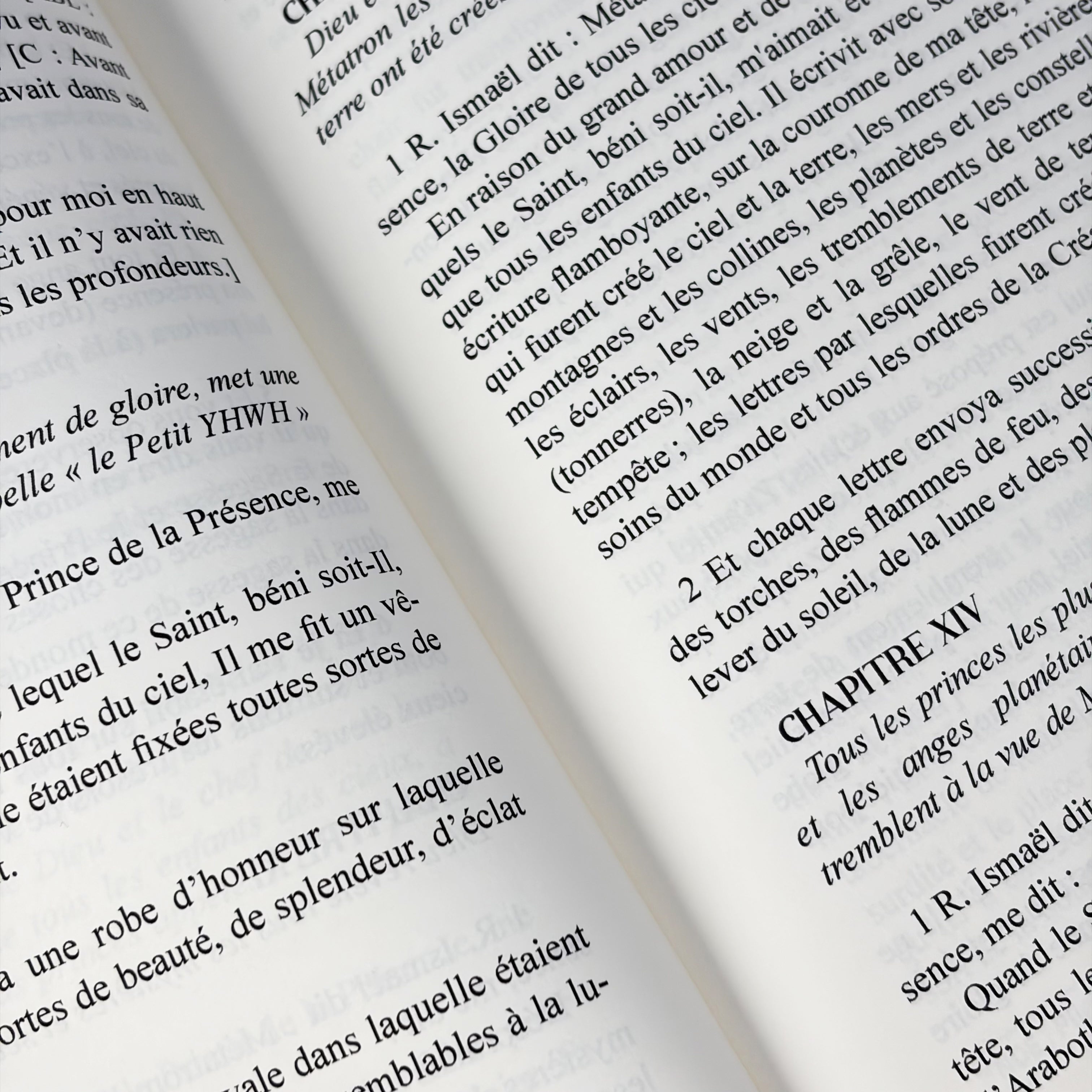 Ce texte se présente sous la voix de Rabbi Ismaël, qui relate un passage vers les hauteurs guidé par Métatron. Le récit suit une progression claire, marquée par la traversée des palais célestes et la découverte d’un ordre structuré, où chaque niveau possède sa fonction et sa place. Métatron, figure centrale, incarne l’homme élevé à un rang supérieur, devenu médiateur entre les plans. Ce livre donne accès à une vision organisée du monde céleste, présentée sans détour, avec une précision qui ancre le texte dans une tradition exigeante et cohérente.