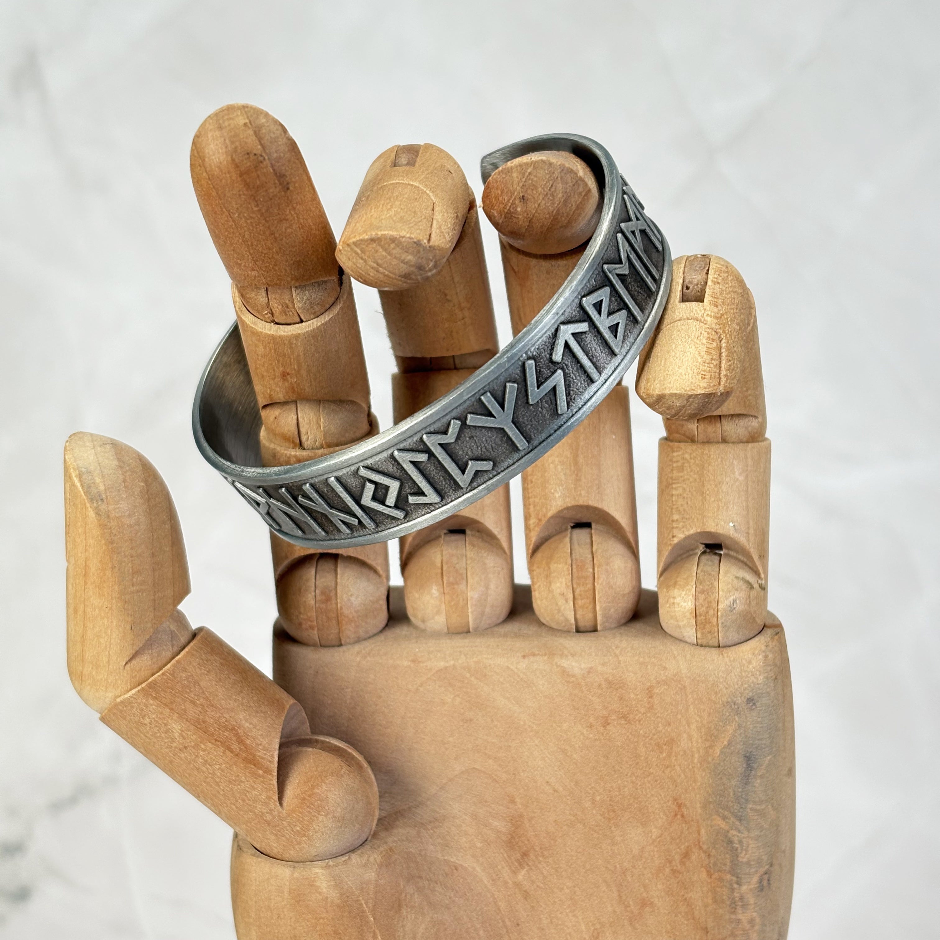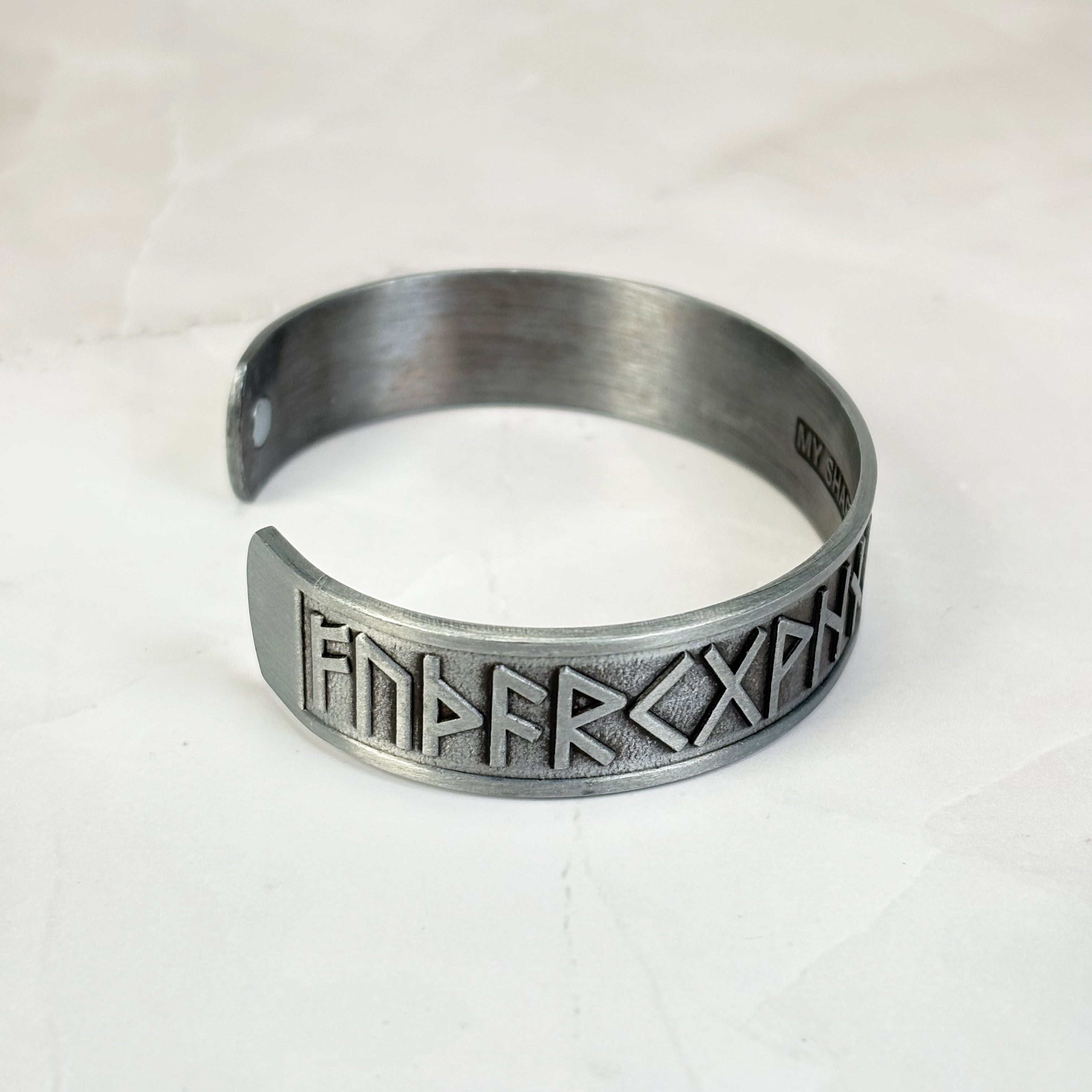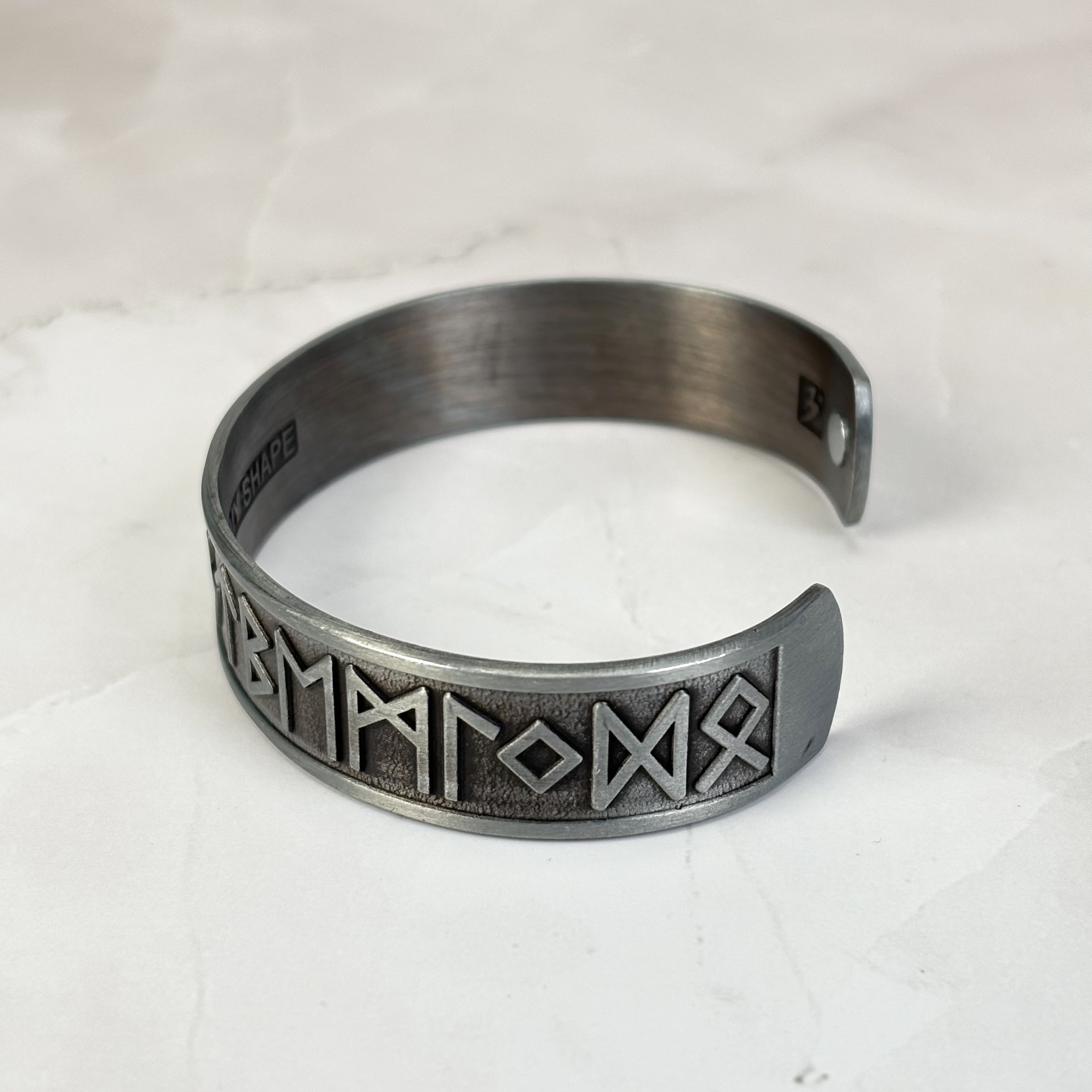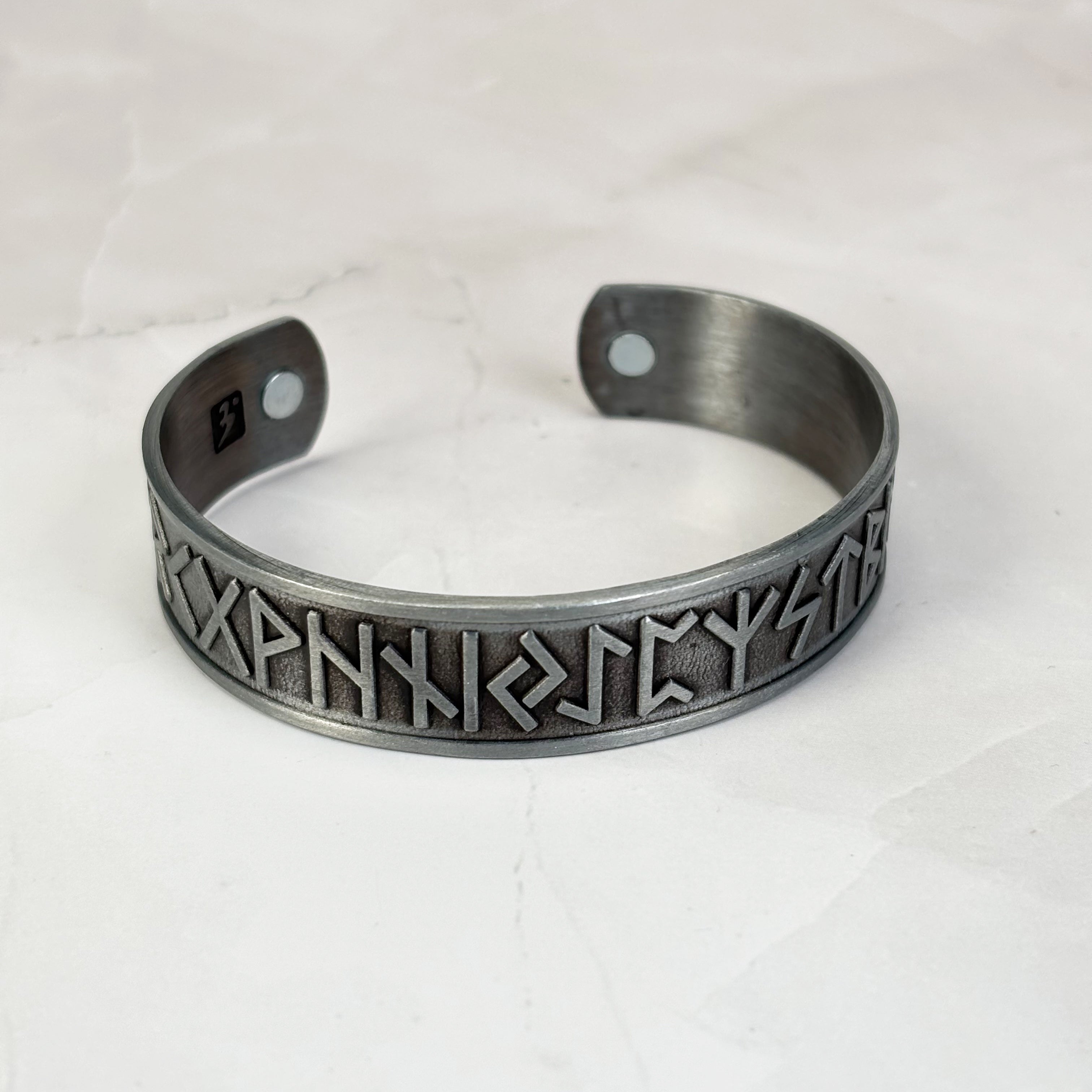Ce bracelet intègre deux aimants et met en valeur les runes de l’Ancien Futhark, système alphabétique runique attesté dans les cultures nordiques anciennes.