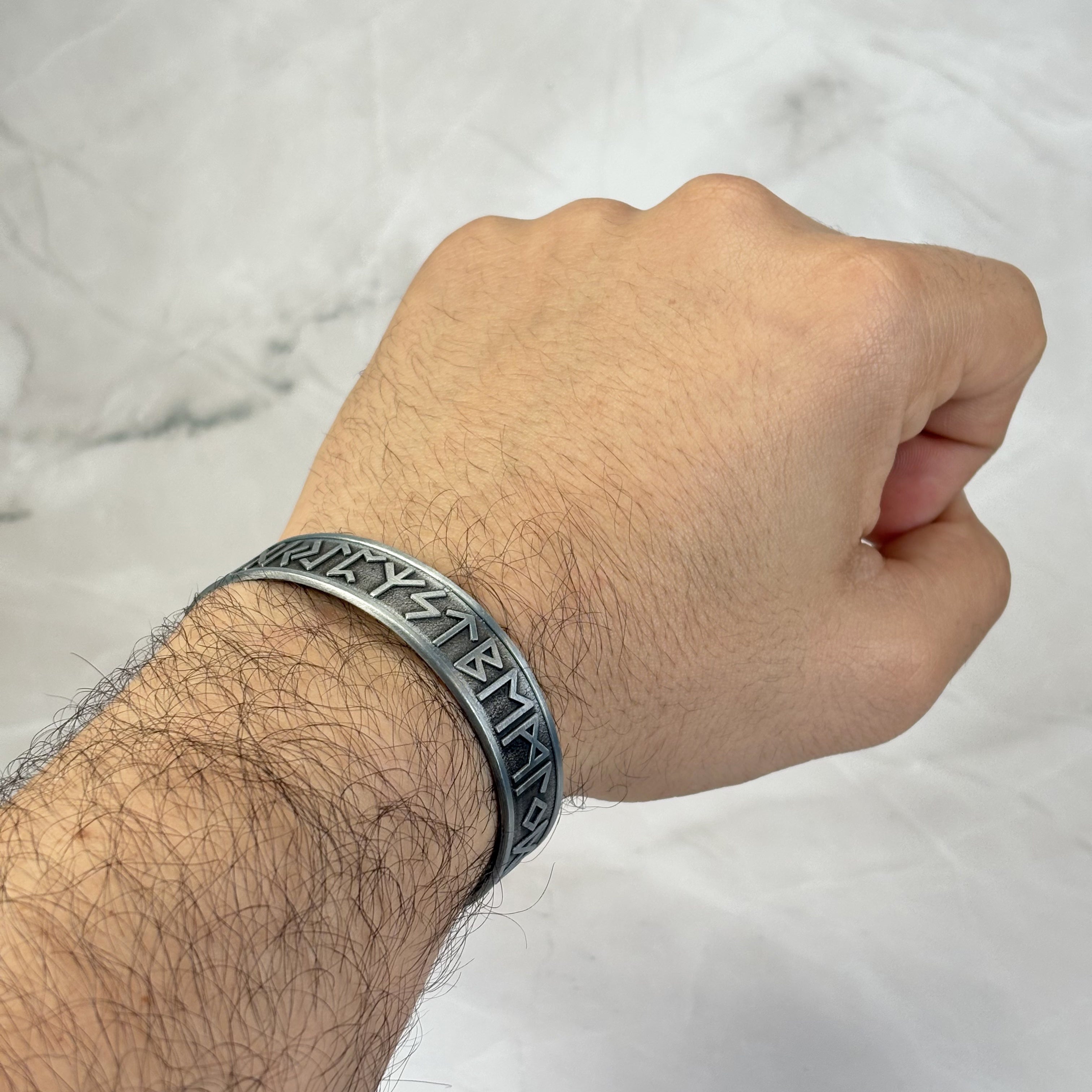 Ce bracelet est fabriqué en couleur argent et intègre deux aimants, mettant en avant les runes de l'Ancien Futhark, un système alphabétique runique utilisé historiquement dans les cultures nordiques.
