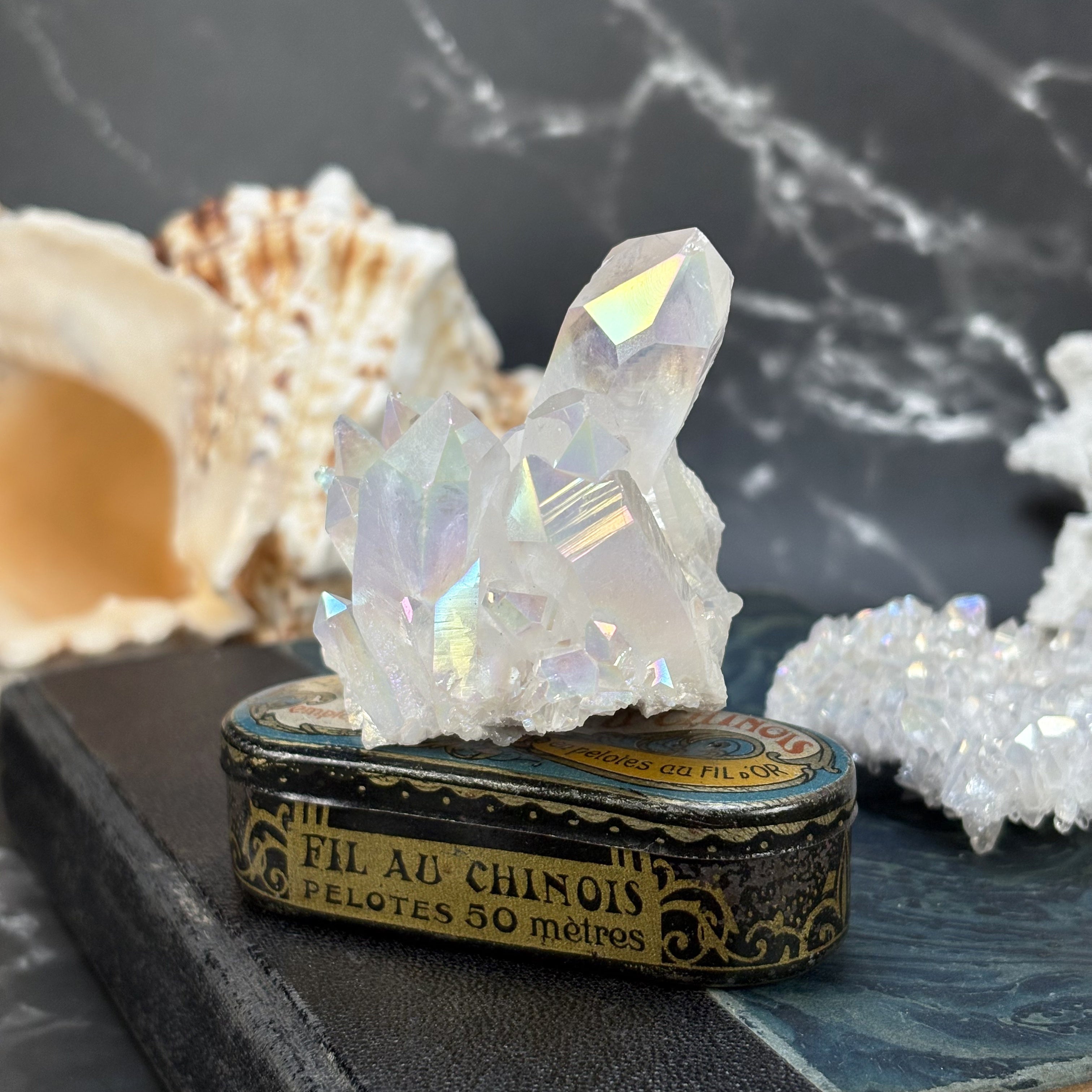 Cette magnifique gerbe naturelle de Quartz Aura de qualité Excelsus (AAA) a été travaillée avec un revêtement Platinum pur à très haute température, offrant cet aspect arc-en-ciel, presque angélique. Ce Quartz Aura Pearl scintillera dans tous les angles.