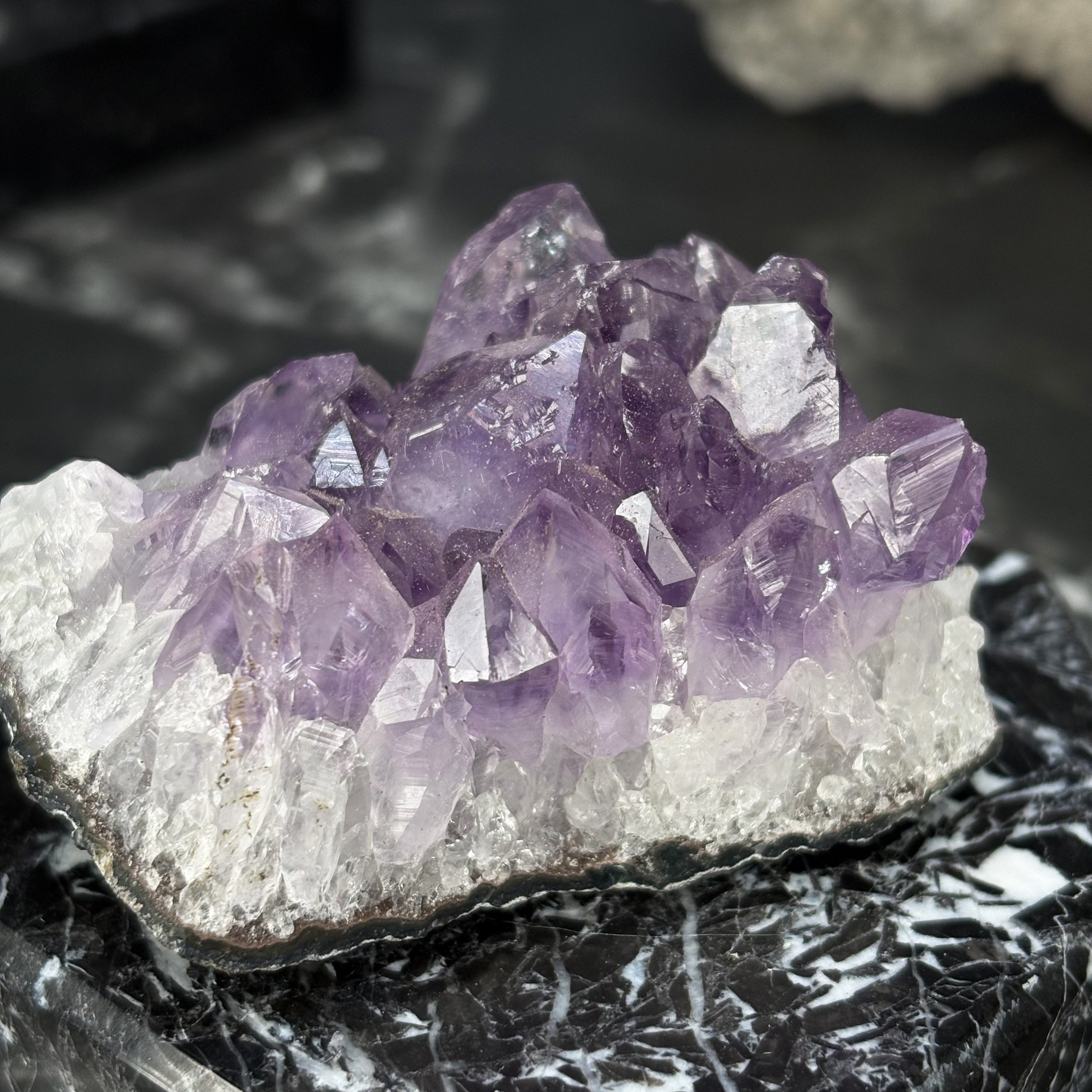 Cette petite druse d'Améthyste sur base naturelle en qualité Excelsus (AAA) est vendue à l'unité.