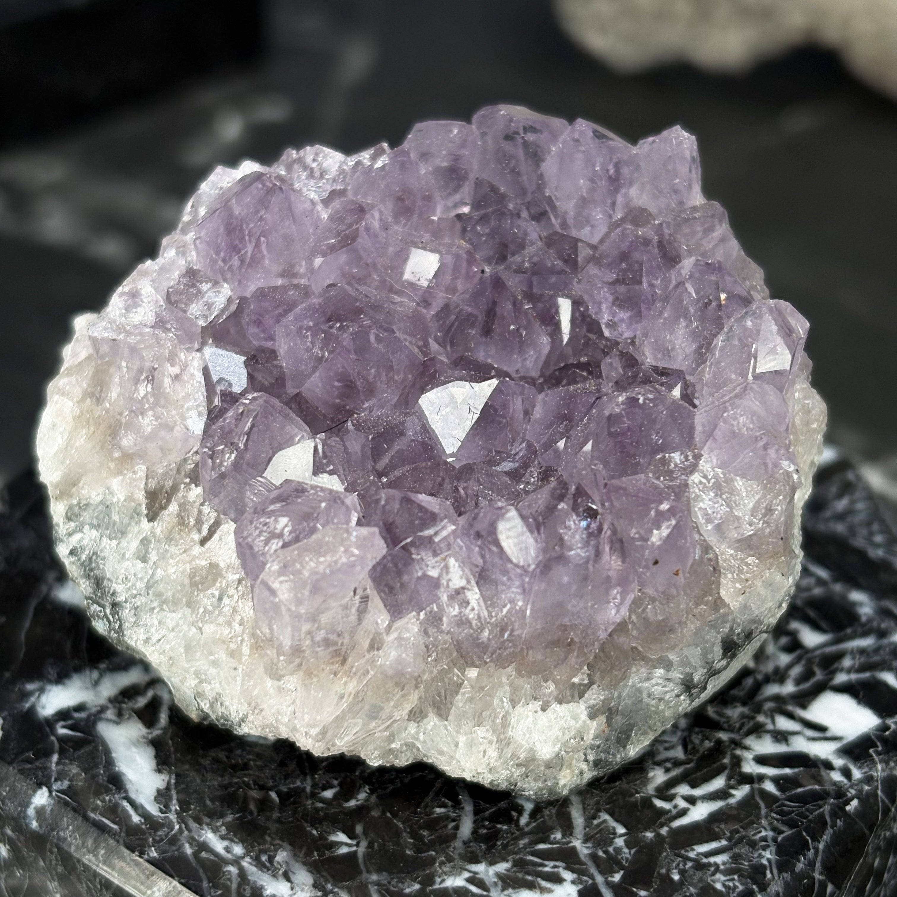 Cette petite druse d'Améthyste sur base naturelle en qualité Excelsus (AAA) est vendue à l'unité.