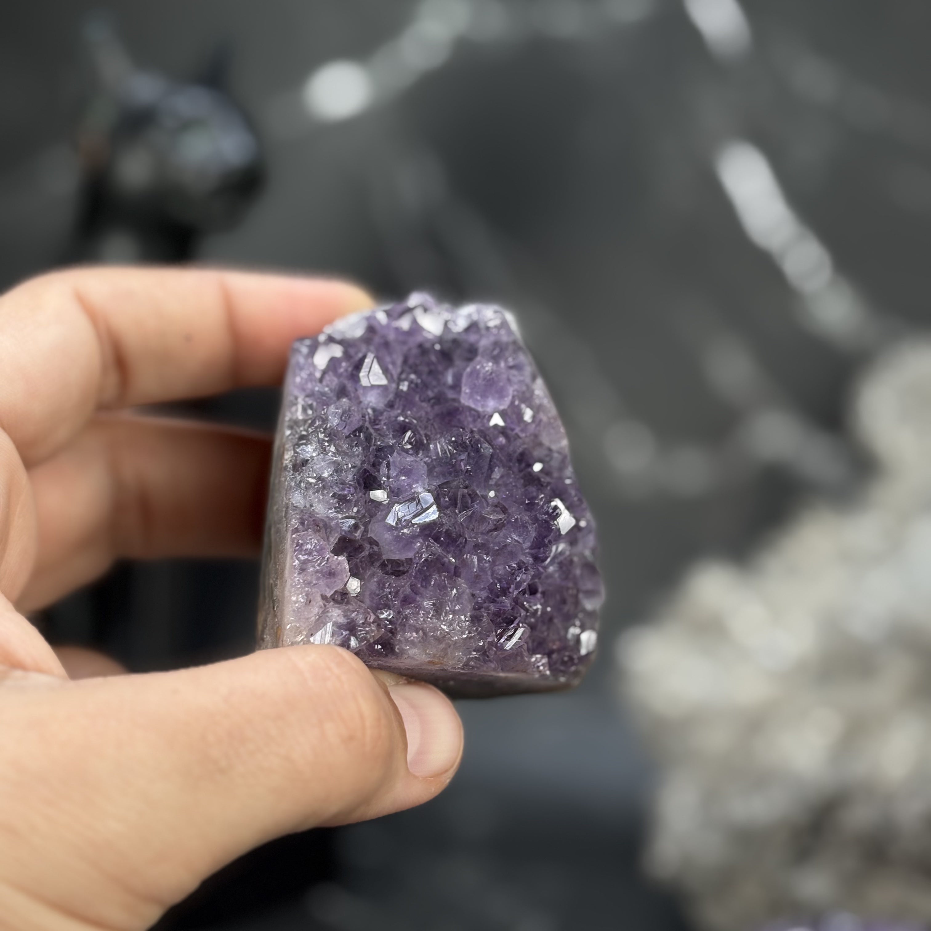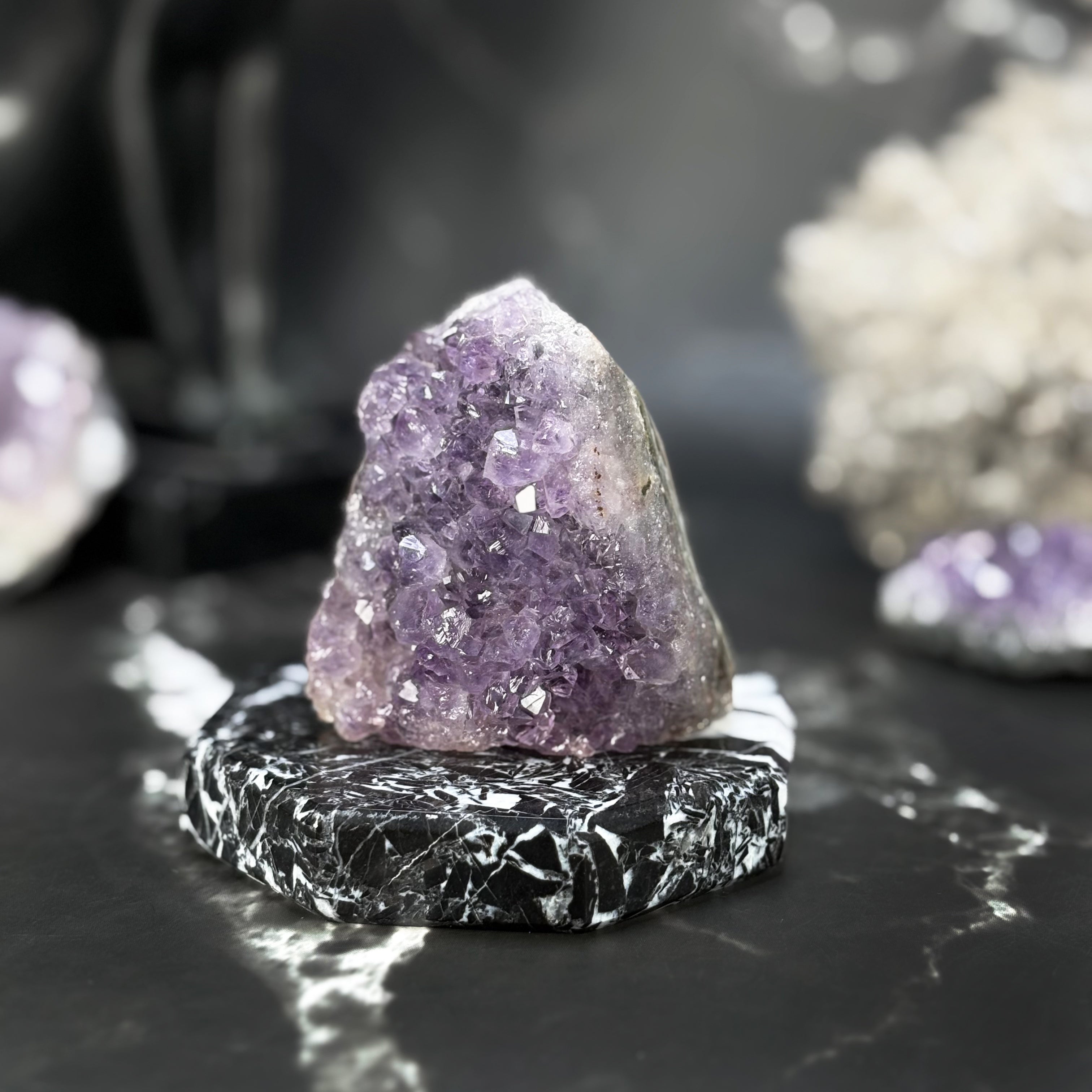 Cette petite druse d’Améthyste repose sur sa base naturelle, taillée afin qu’elle puisse tenir debout. Cette présentation met en valeur la structure cristalline de la pierre, ses pointes brillantes et ses nuances violettes lumineuses. En qualité Excelsus (AAA), elle offre une pureté visuelle remarquable et une esthétique délicate qui attire immédiatement le regard. Vendue à l’unité, elle trouve aisément sa place sur un autel, un bureau ou un espace de méditation. Chaque druse possède sa propre identité.