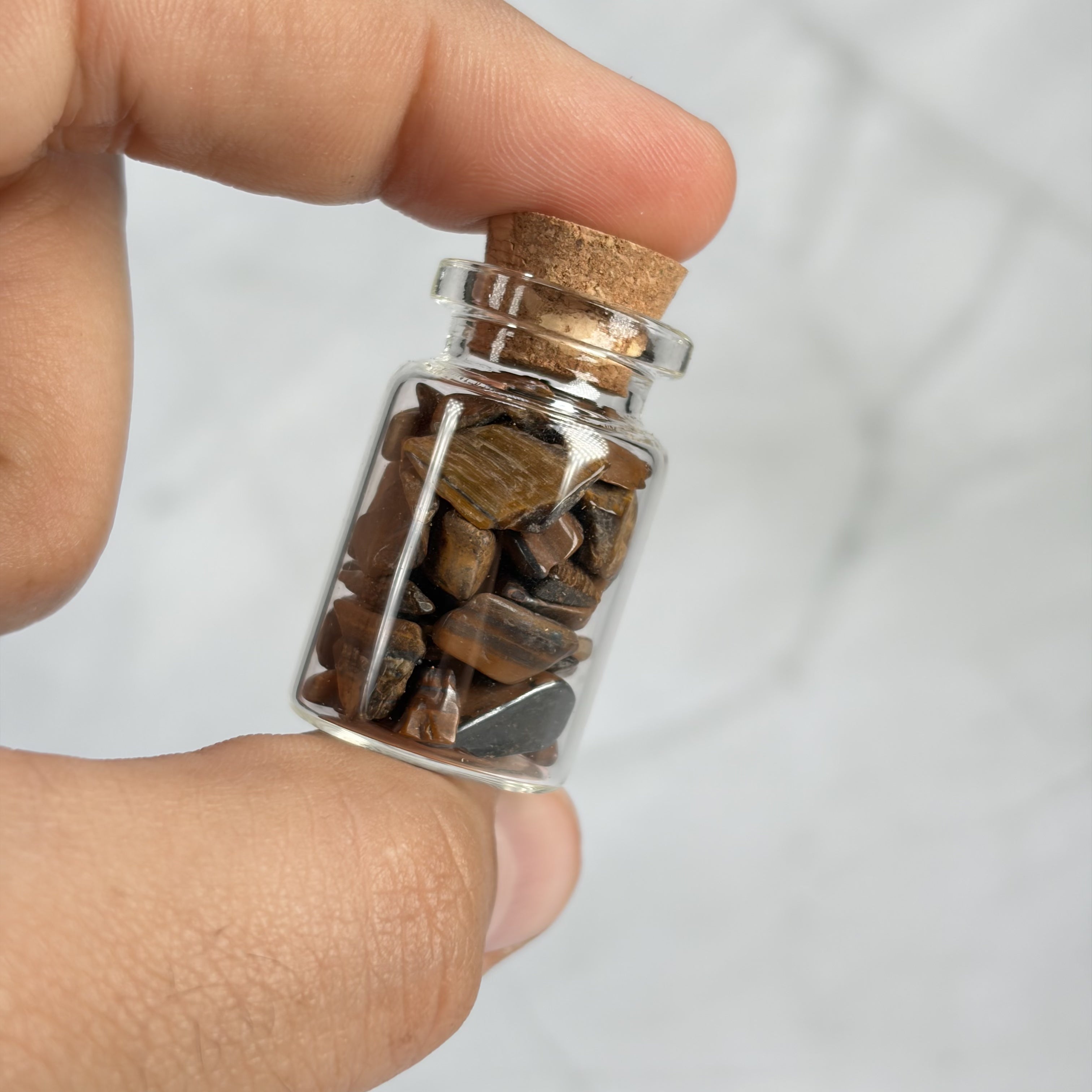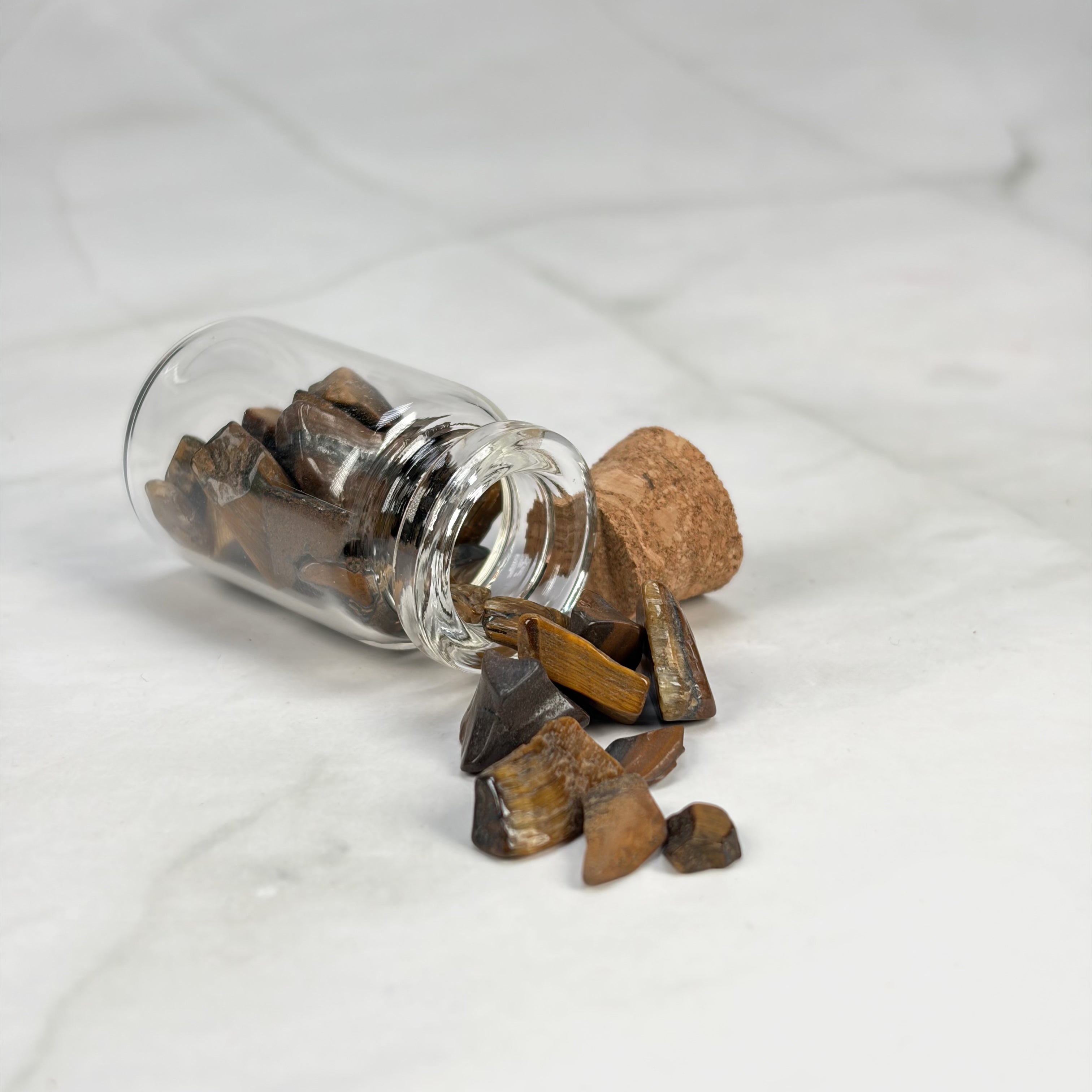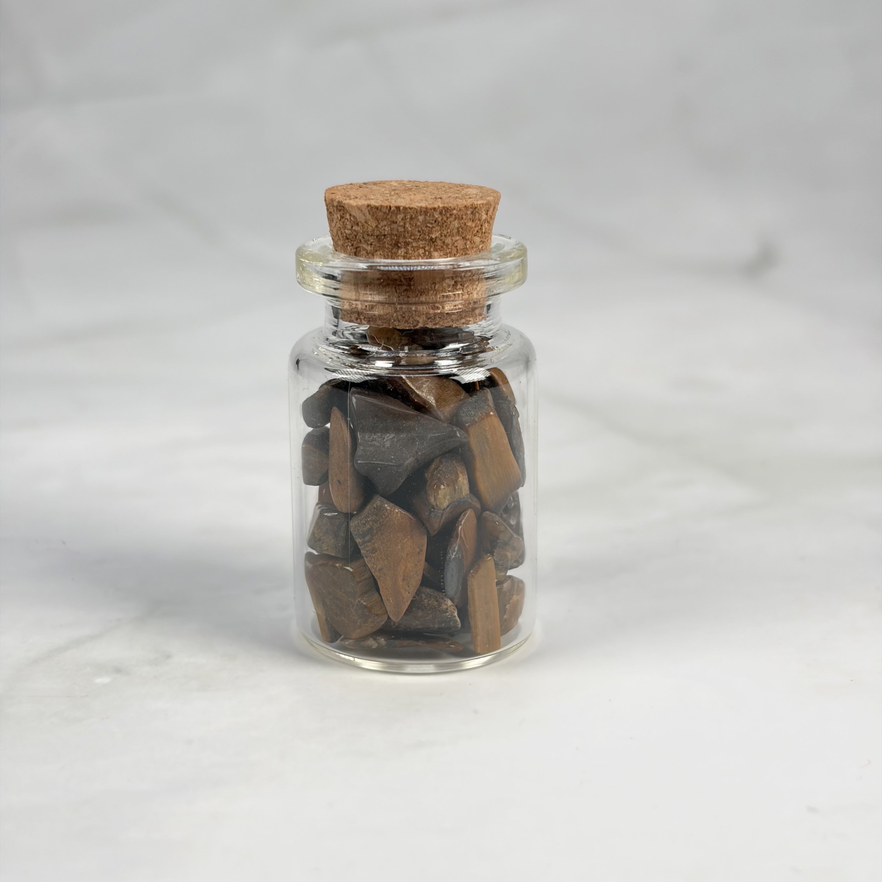 Ces éclats d'Œil de Tigre sont contenus dans une fiole en verre avec bouton en liège.