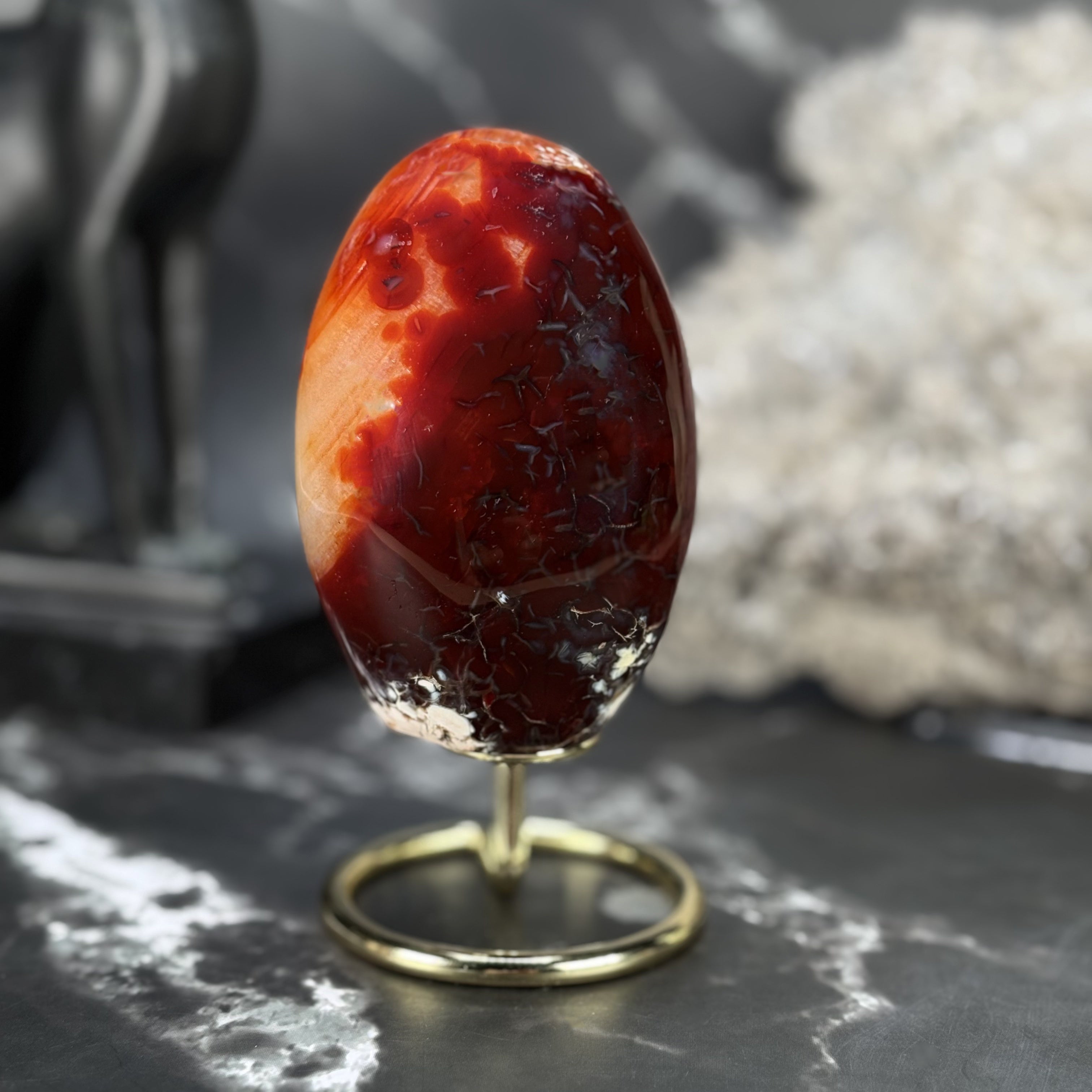 La Cornaline occupe une place importante dans l’histoire, en particulier dans l’Égypte antique où elle accompagnait les défunts dans leur passage vers l’au-delà. Les parures funéraires en contenaient fréquemment, car la pierre était perçue comme un guide et une protection dans le voyage après la mort. Sa couleur chaude, rouge et vibrante évoquait le « soleil couchant », image liée au sang, à la vie et à la régénération. Cette symbolique ancienne lui confère une aura liée au mouvement, au passage et à la continuité entre les cycles. La Cornaline représente ainsi une pierre profondément vivante, associée à l’élan vital et à la puissance intérieure.