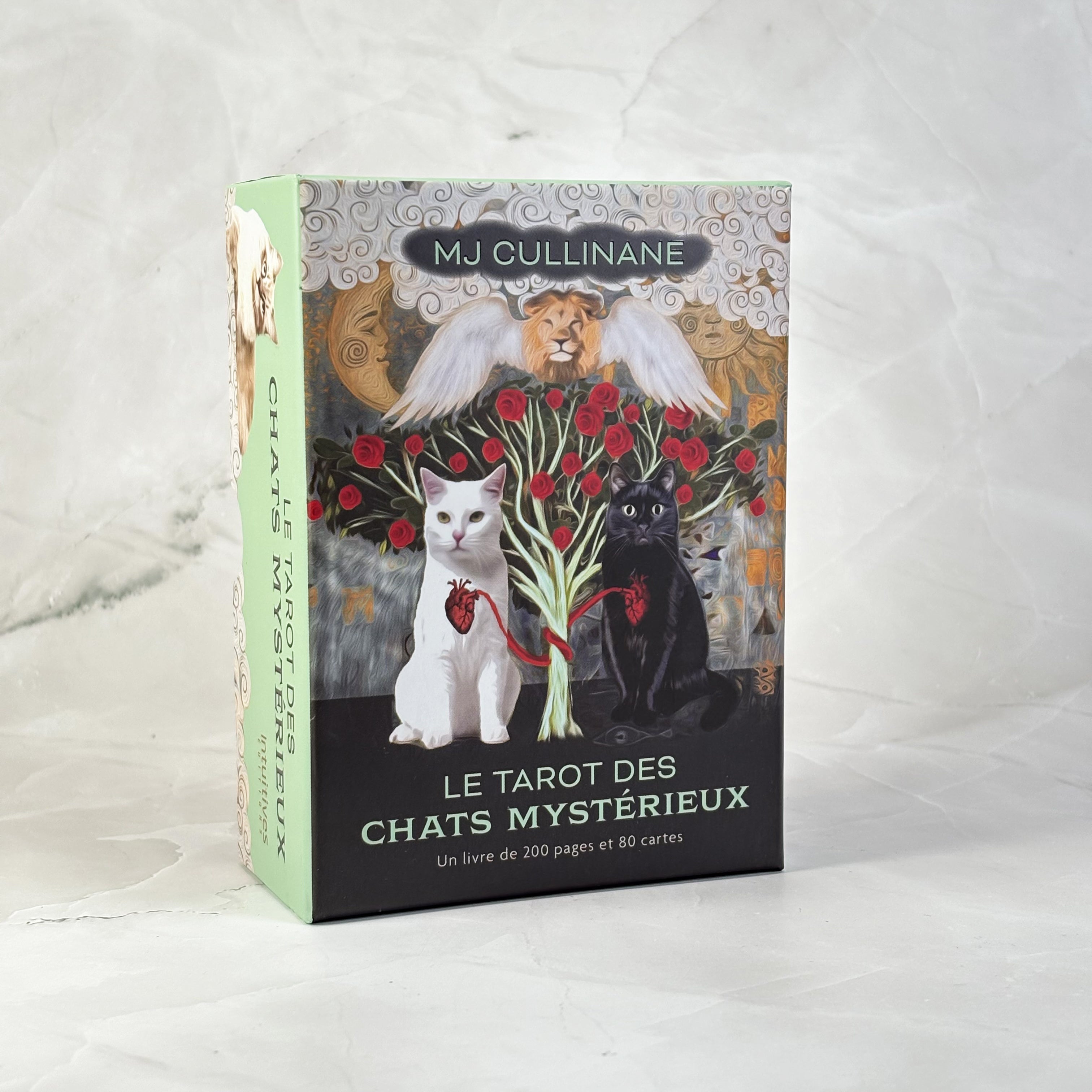 Conçu dans l’esprit du tarot Rider Waite Smith et enrichi de deux arcanes majeurs supplémentaires, ce jeu de 80 cartes met en scène des chats aux visages multiples, tantôt bienveillants, tantôt farouches, tantôt gracieux ou maladroits. Chaque illustration participe à un récit symbolique où se déploie une véritable traversée intérieure.