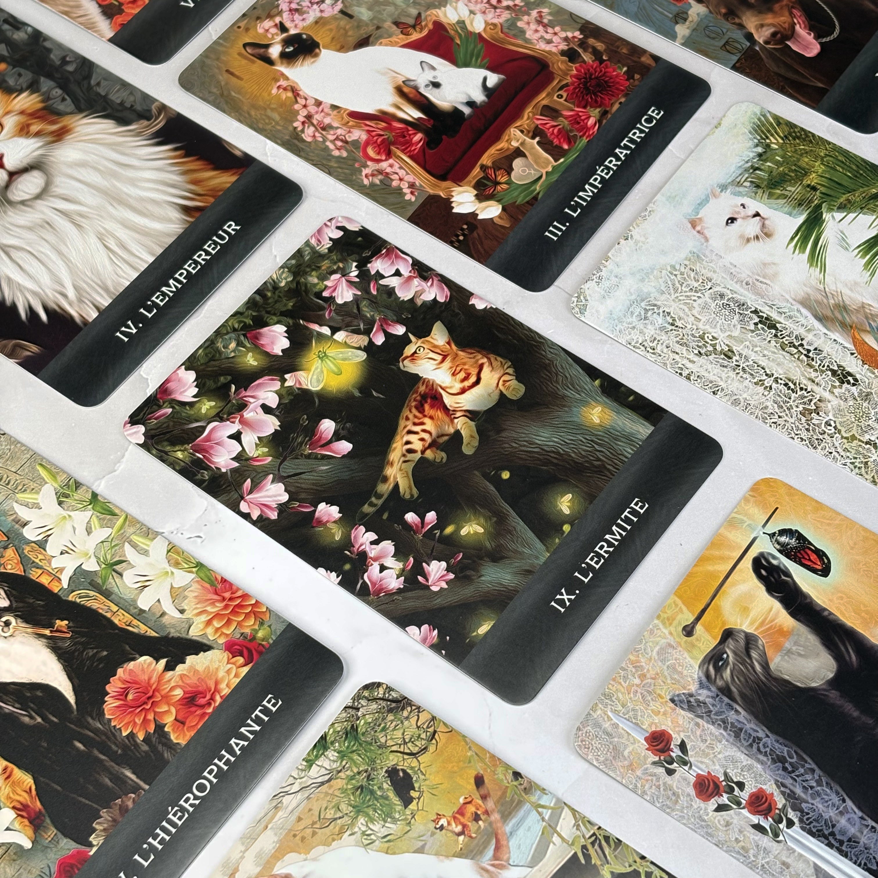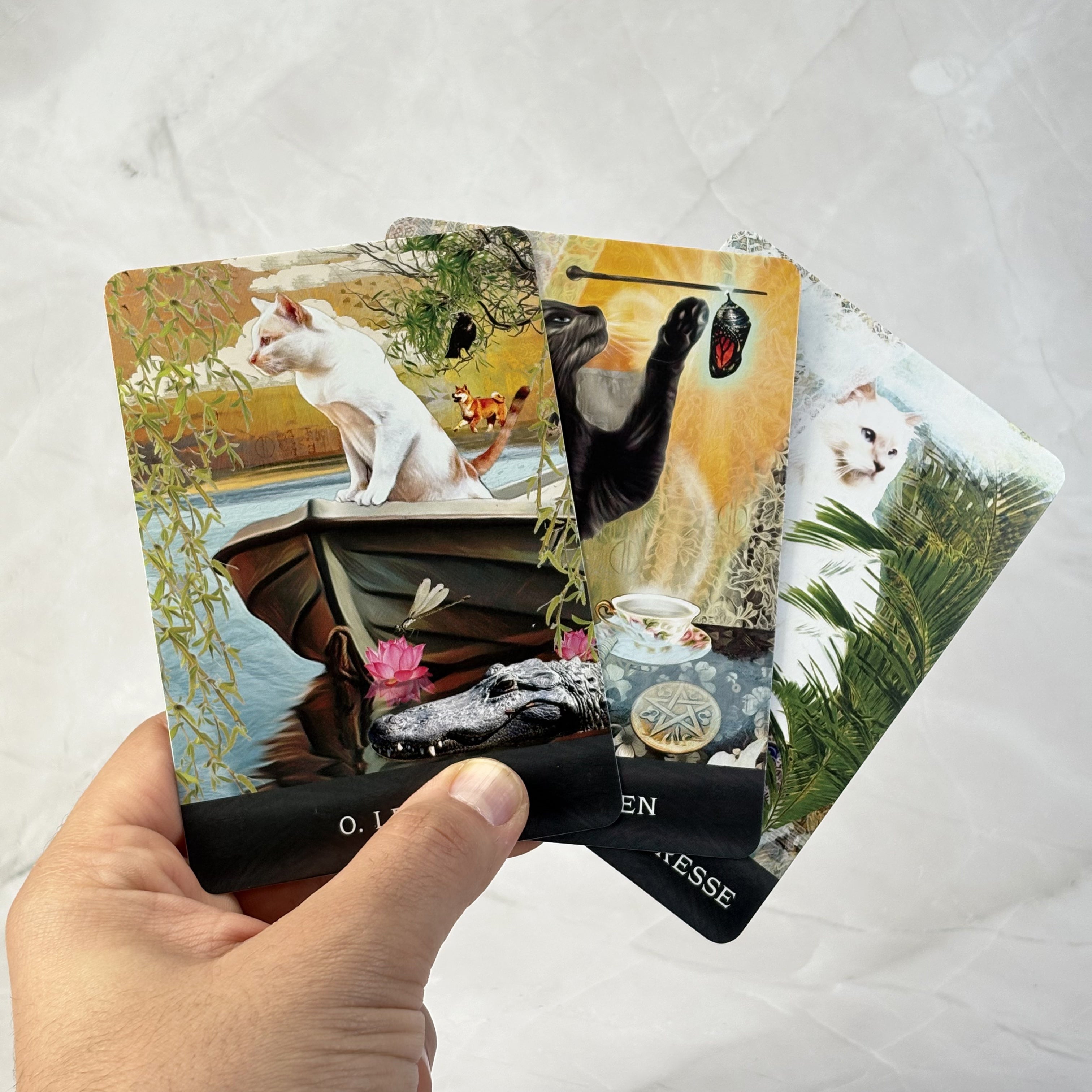 Conçu dans l’esprit du tarot Rider Waite Smith, ce jeu se compose de 80 cartes, incluant deux arcanes majeurs supplémentaires. Chaque lame met en scène des figures félines aux expressions variées, tantôt bienveillantes, tantôt farouches, tantôt élégantes ou maladroites. Les illustrations construisent un récit symbolique cohérent, dans lequel le parcours des arcanes devient une véritable traversée intérieure. Le chat y incarne tour à tour guide, miroir et révélateur des situations rencontrées.