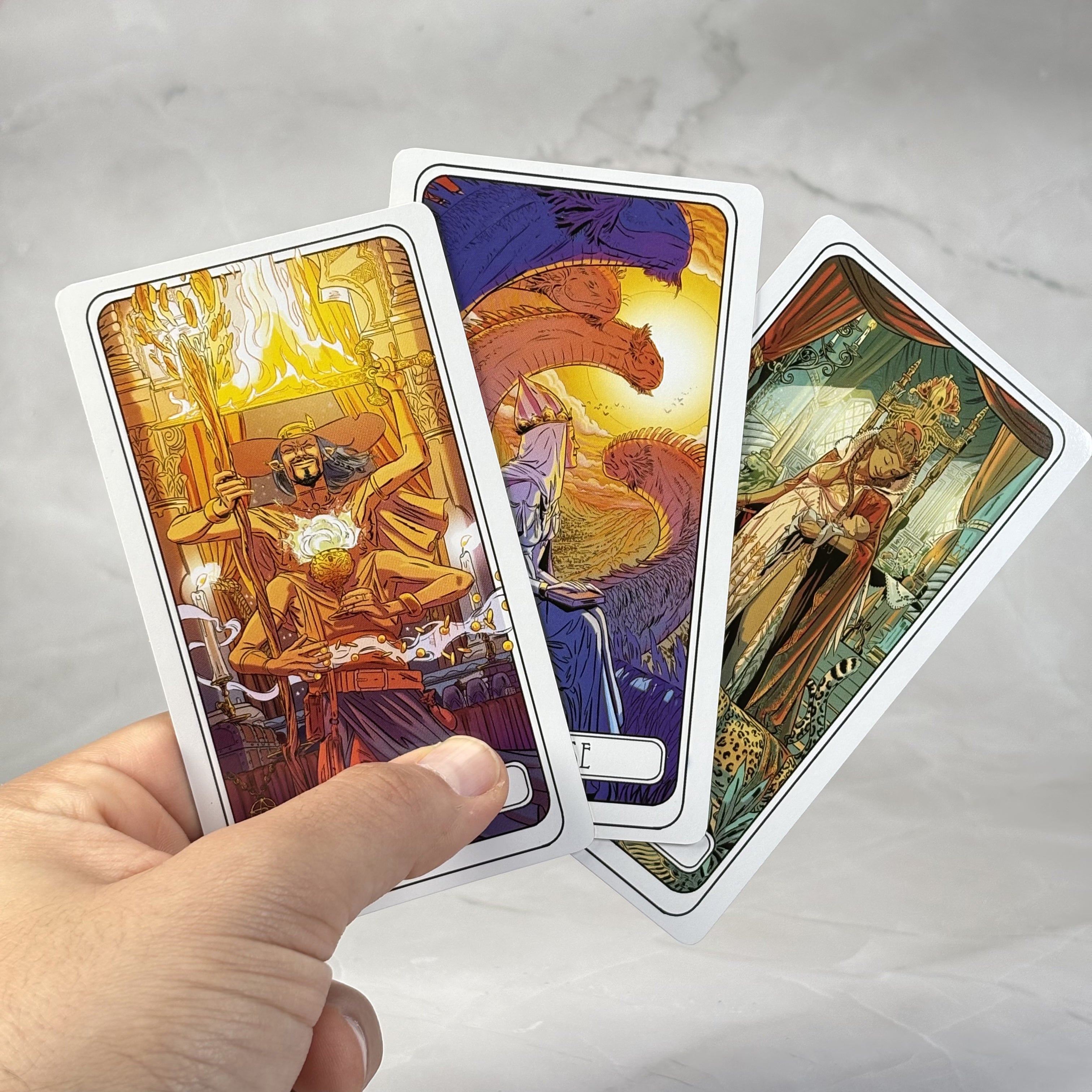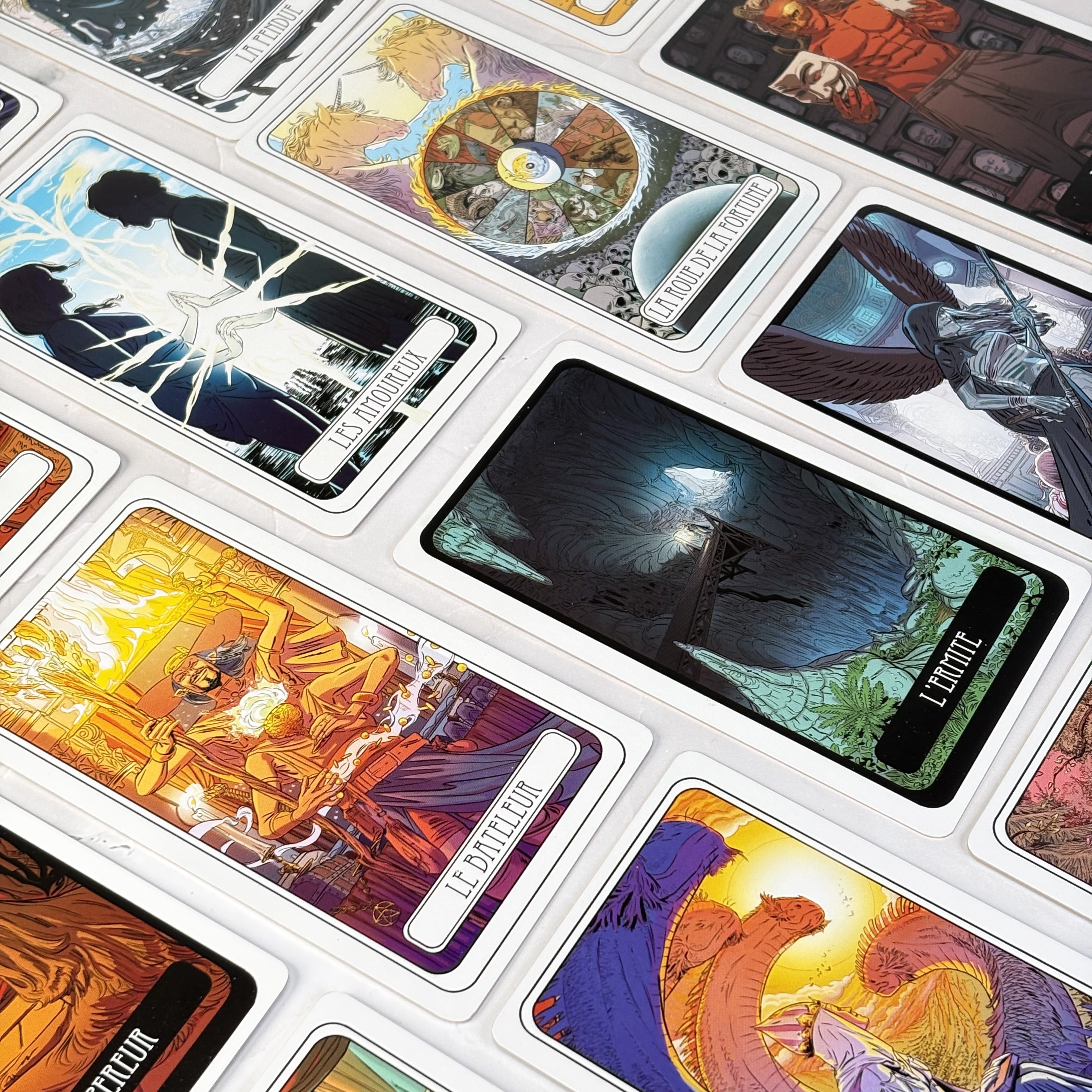 Ce tarot accorde une place centrale à la figure féminine, longtemps reléguée à l’arrière-plan des représentations classiques. Cette orientation donne une nouvelle respiration aux arcanes et propose une vision plus équilibrée de l’univers symbolique du tarot. Les soixante-dix-huit lames, illustrées par Rémi Torregrossa, auteur de bande dessinée reconnu pour la richesse et la précision de son trait, offrent une lecture visuelle forte et cohérente, fidèle à l’esprit du Tarot de Marseille tout en affirmant une identité propre.