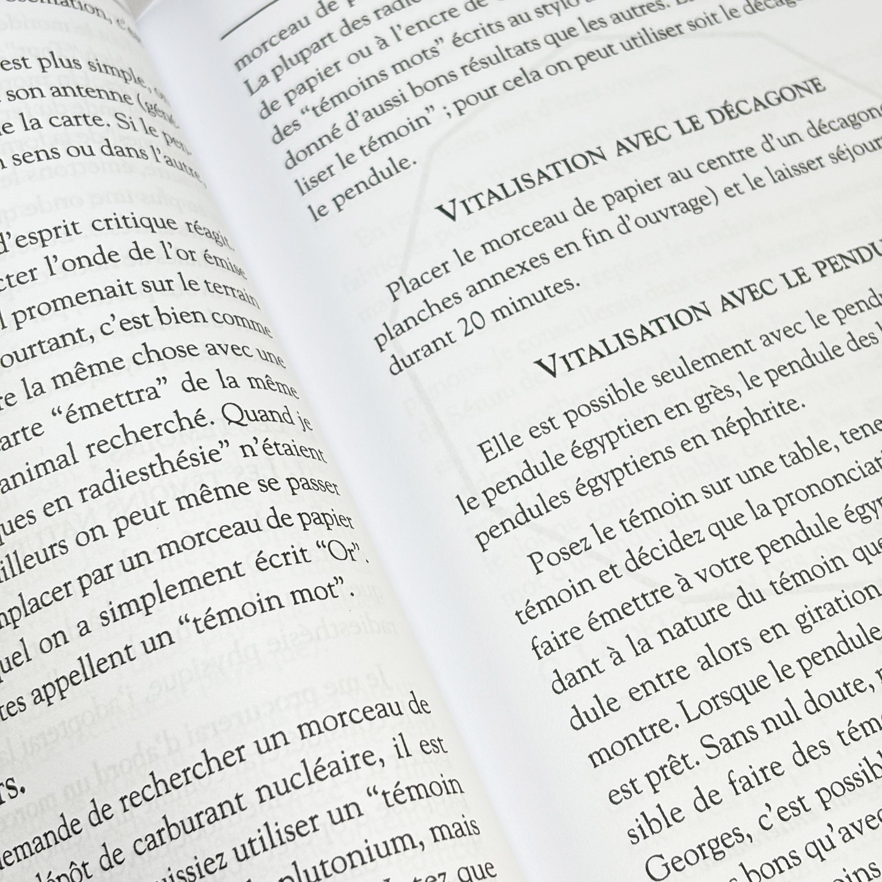 Le livre détaille ensuite l’usage du pendule en radiesthésie mentale, en précisant les conditions de travail et la posture à adopter. Il aborde également son association avec la pyramide, ainsi que l’utilisation du cadran zodiacal, en donnant des repères précis à chaque phase. L’ensemble avance de manière fluide, avec des explications claires qui permettent une compréhension rapide et une mise en pratique sans confusion.