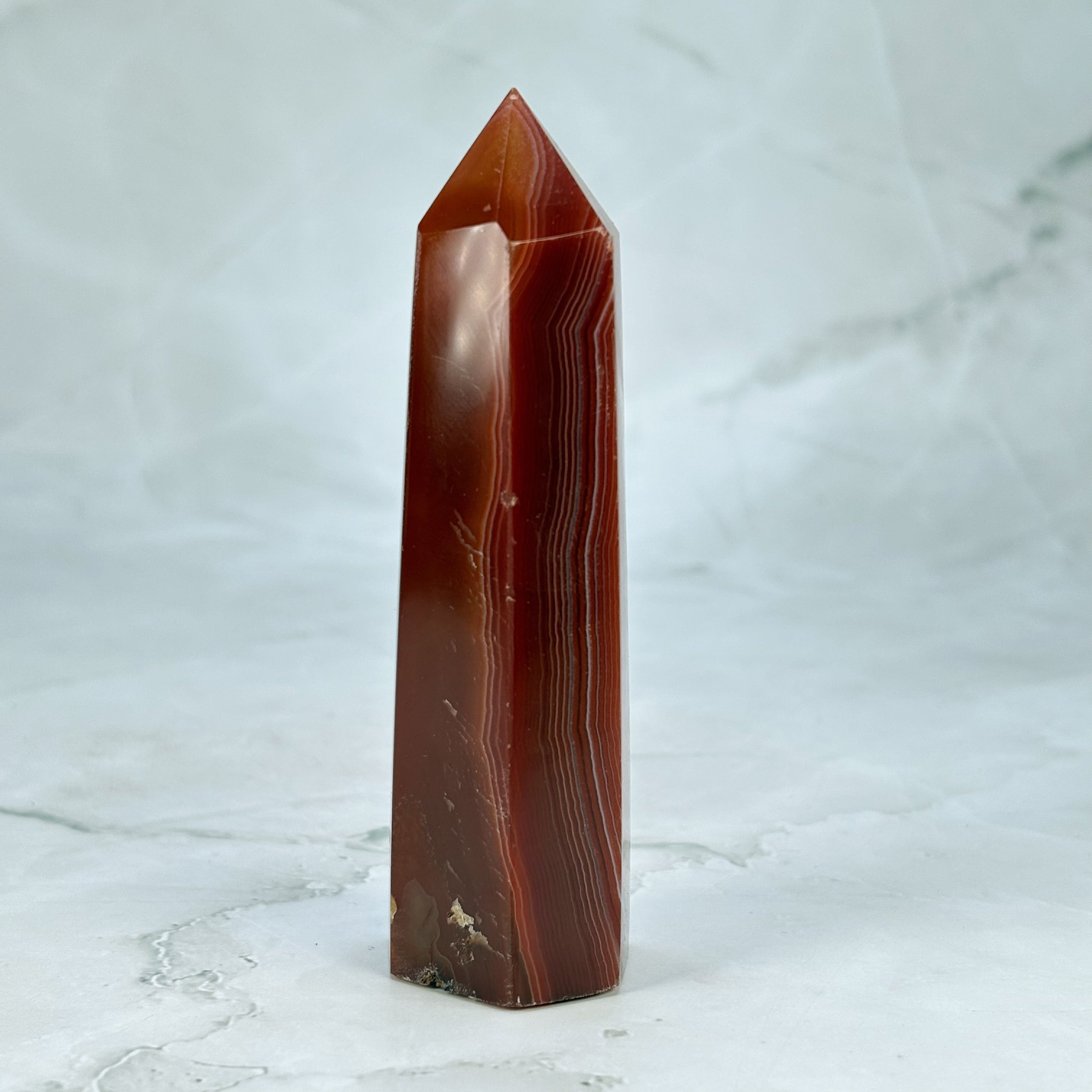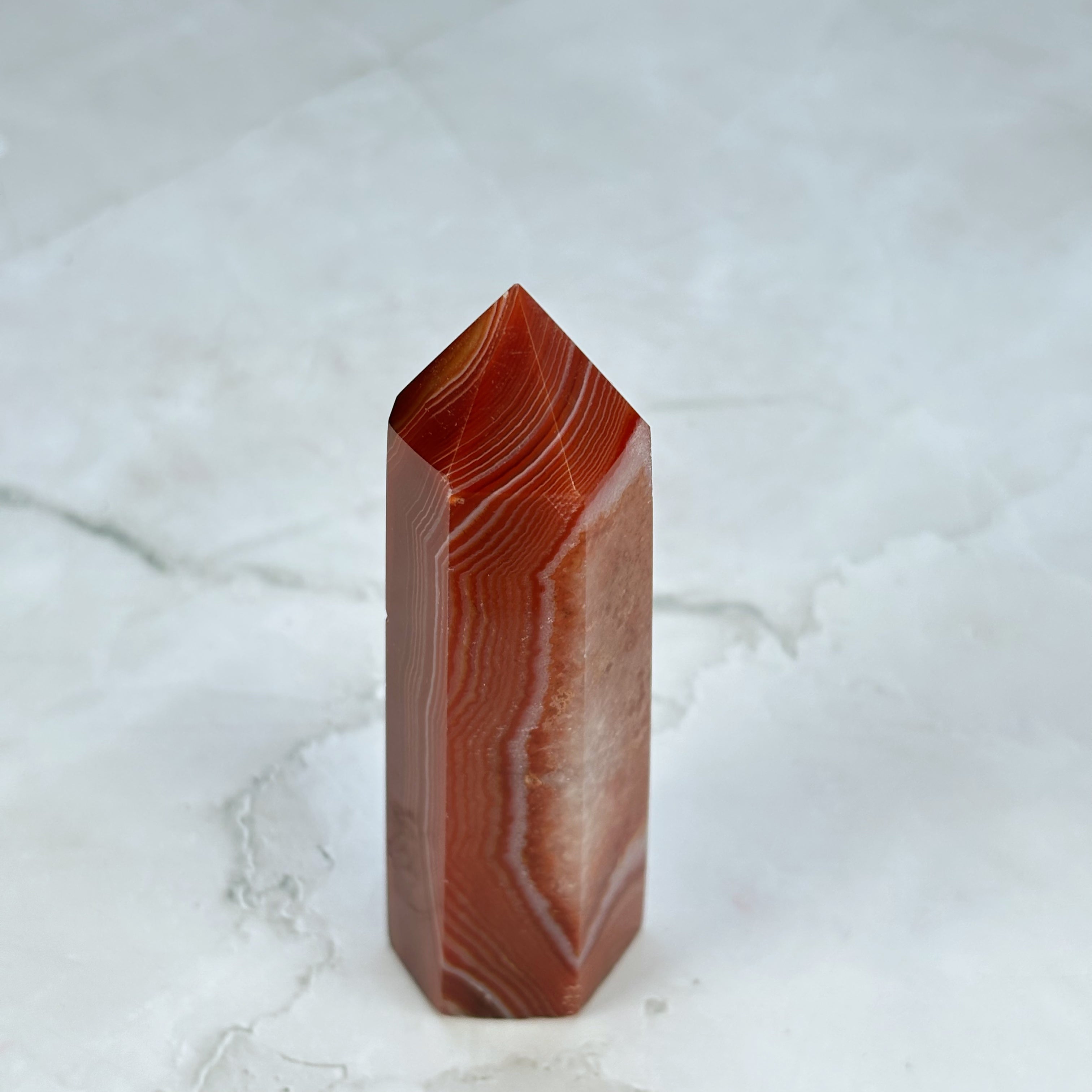 La Sardonyx est une calcédoine rubanée mêlant les tons brun-rouge de la sard aux bandes blanches ou noires de l’onyx. Cette pierre accompagne l’histoire humaine depuis l’Antiquité, où elle servait à la gravure de camées et d’intailles destinés aux sceaux, aux anneaux et aux talismans. Les soldats romains portaient des amulettes de Sardonyx gravées de Mars ou d’Hercule, afin d’obtenir courage et protection lors des batailles. Aujourd’hui encore, elle reste associée à la lucidité, à la cohésion entre les individus et à l’apaisement des tensions. Cette pointe met en valeur ses bandes naturelles et offre une présence forte et harmonieuse.