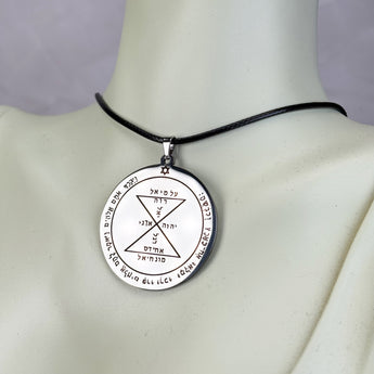 Le 3ème pentacle de Vénus se présente sous la forme d’une figure centrale composée de deux triangles opposés, reliés par leurs pointes et inscrits dans un cercle. À l’intérieur de ces triangles figurent des noms et des lettres hébraïques disposés avec précision, tandis que le pourtour extérieur du talisman porte une inscription continue en caractères sacrés. Cette structure géométrique exprime l’impact immédiat de la rencontre entre deux forces convergentes, traduisant visuellement l’effet soudain de l’attrait et de l’admiration. Par sa forme et ses inscriptions, ce sceau relie son porteur à l’influence vénusienne dans sa dimension la plus directe, orientée vers l’éveil instantané de l’amour et de l’estime.