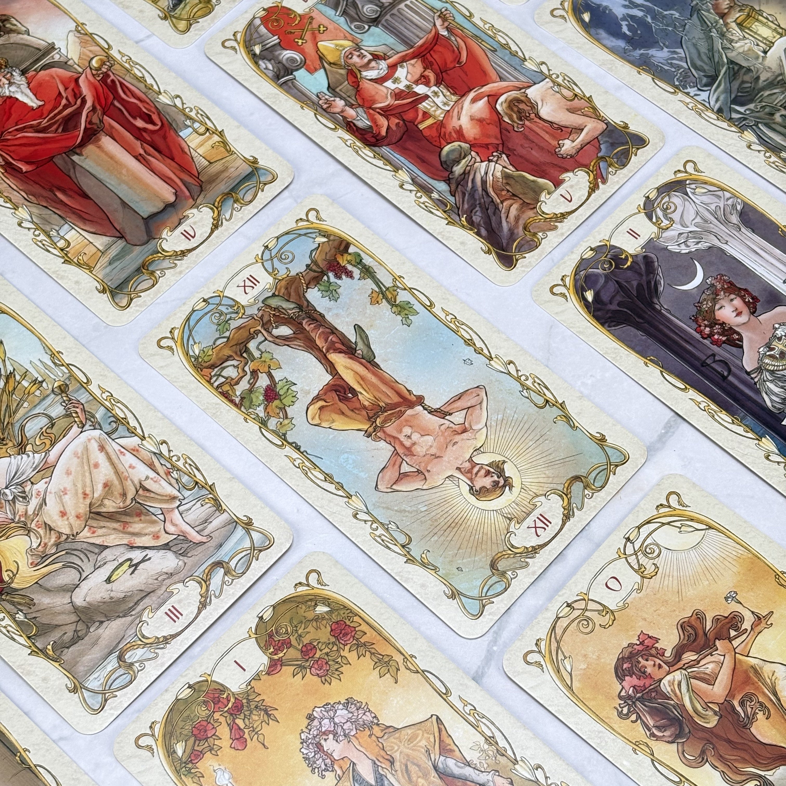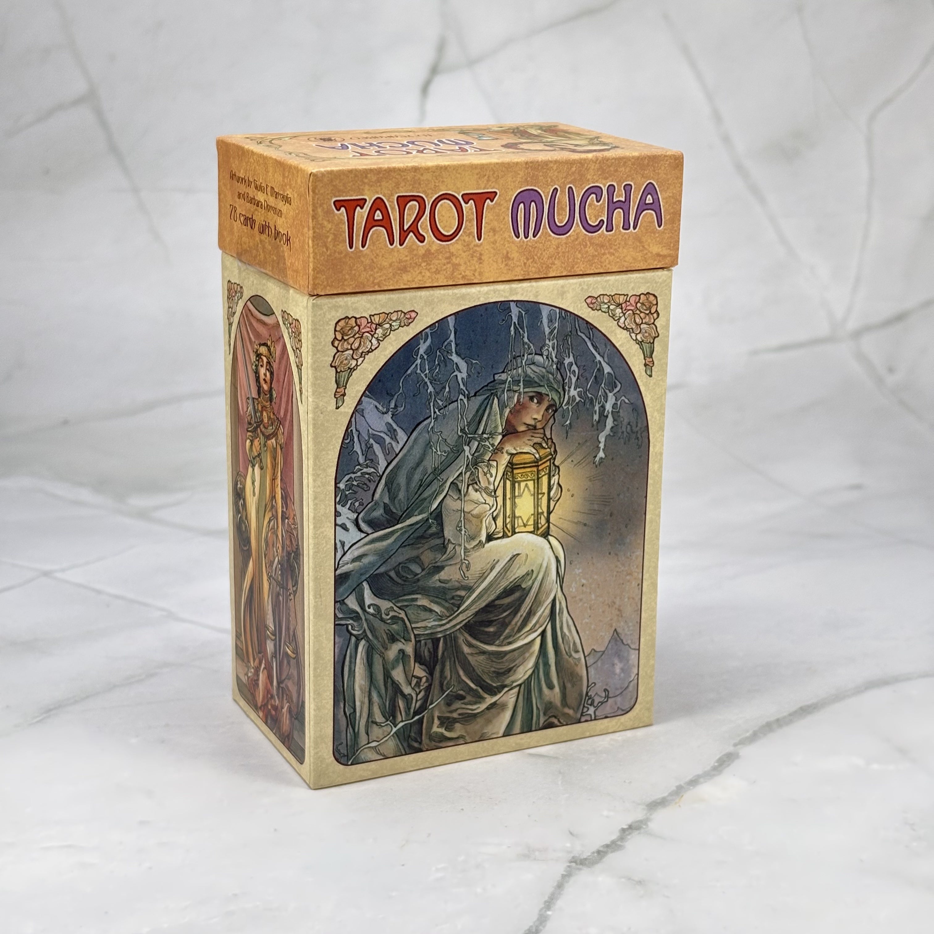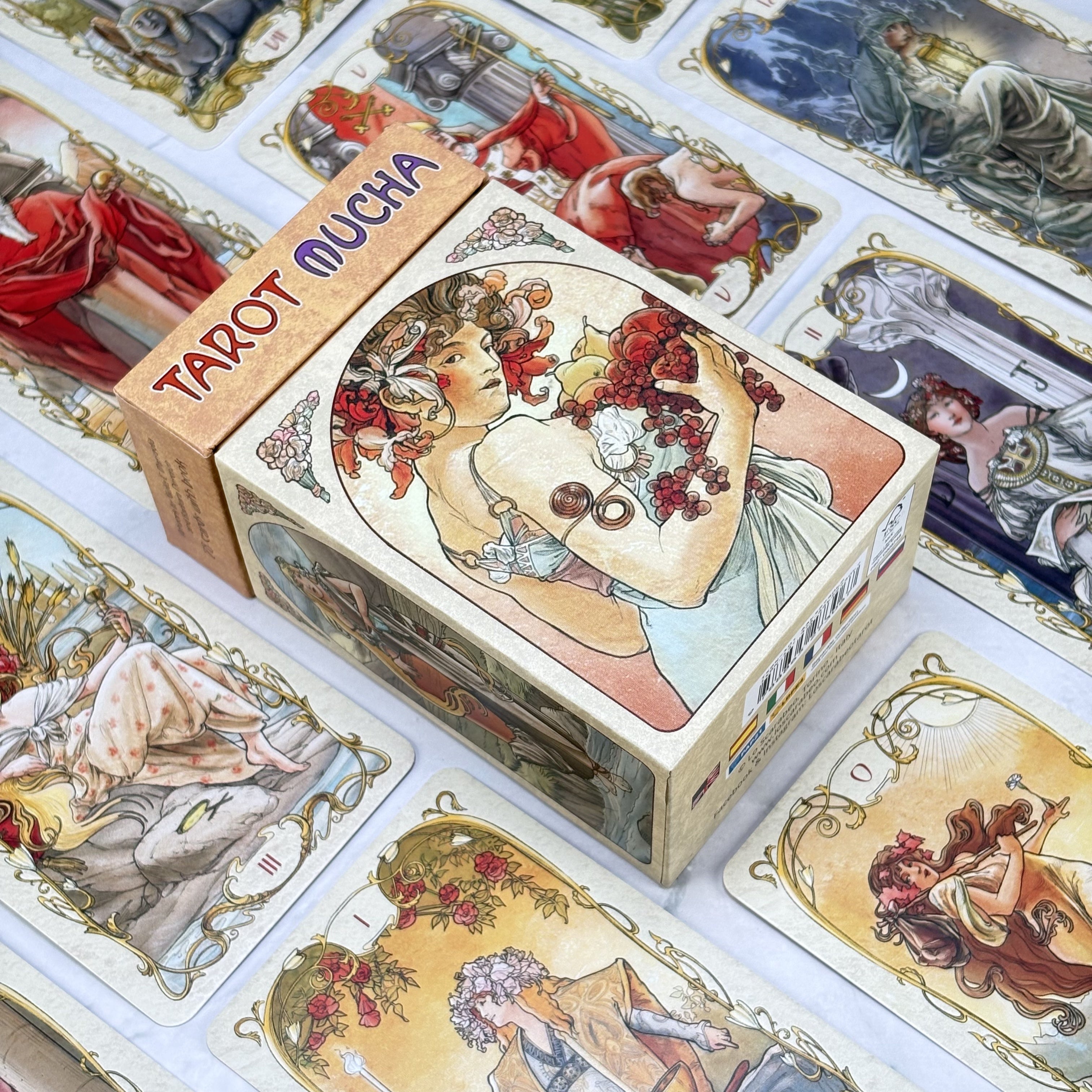 Le Tarot Mucha rend hommage à l’univers graphique d’Alphonse Mucha, figure majeure de l’Art Nouveau et artiste dont l’esthétique marqua la Belle Époque. Ses lignes sinueuses, ses compositions florales et ses figures féminines auréolées d’ornements trouvent ici une nouvelle expression à travers les arcanes du tarot. Ce jeu transpose l’élégance décorative propre à Mucha dans un cadre divinatoire cohérent et harmonieux.