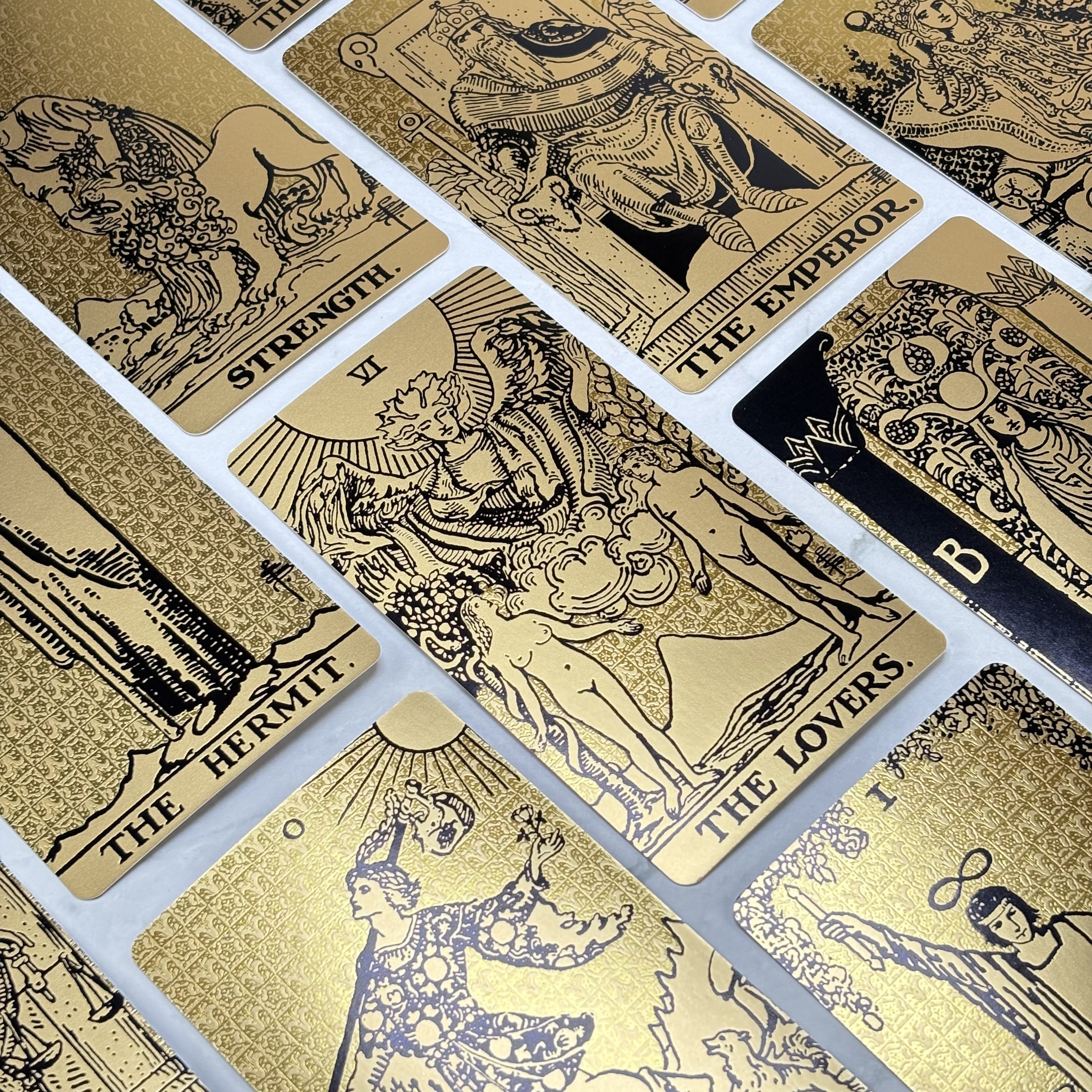 Cette édition limitée du Tarot Rider-Waite-Smith propose une interprétation luxueuse d’un grand classique de la cartomancie occidentale. Les 78 cartes se parent d’une feuille d’or éclatante sur laquelle se détachent des illustrations en noir texturé, mettant en valeur le trait expressif de Pamela Colman Smith. Le contraste entre l’or et le noir crée une présence visuelle forte, idéale pour celles et ceux qui recherchent un support à la fois élégant et affirmé.