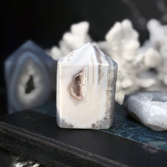 Dans les rituels de magie blanche, l’Agate Druzy trouve sa place sur les autels consacrés à l’harmonie familiale, à la restauration de liens brisés ou à la paix intérieure. Elle est aussi utilisée pour sceller un sort d’apaisement ou renforcer une demande adressée à une entité protectrice. Certains l’enroulent dans un tissu bleu ou argent et la laissent à la lumière de la lune croissante pour nourrir un charme lié à la sérénité ou à la réconciliation. Sa beauté brute ajoute une dimension symbolique aux objets magiques, renforçant l’intention de ceux qui la manipulent avec foi et respect.